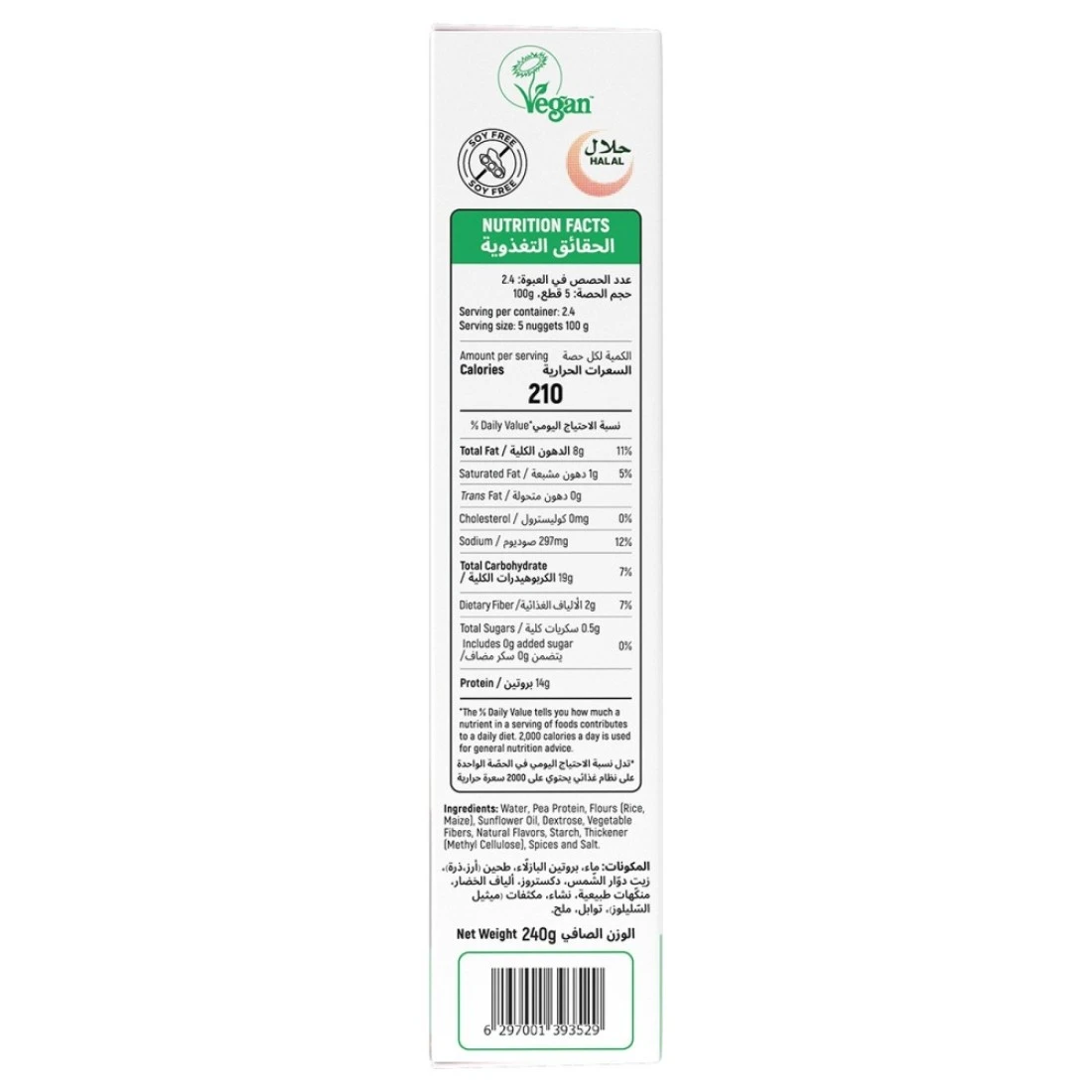 ingredients : Water, Pea Protein, Flours (Rice, Maize), Sunflower Oil, Dextrose, Vegetable Fibers, Natural Flavours, Starch, Thickener (Methyl Cellulose), Spices and Salt