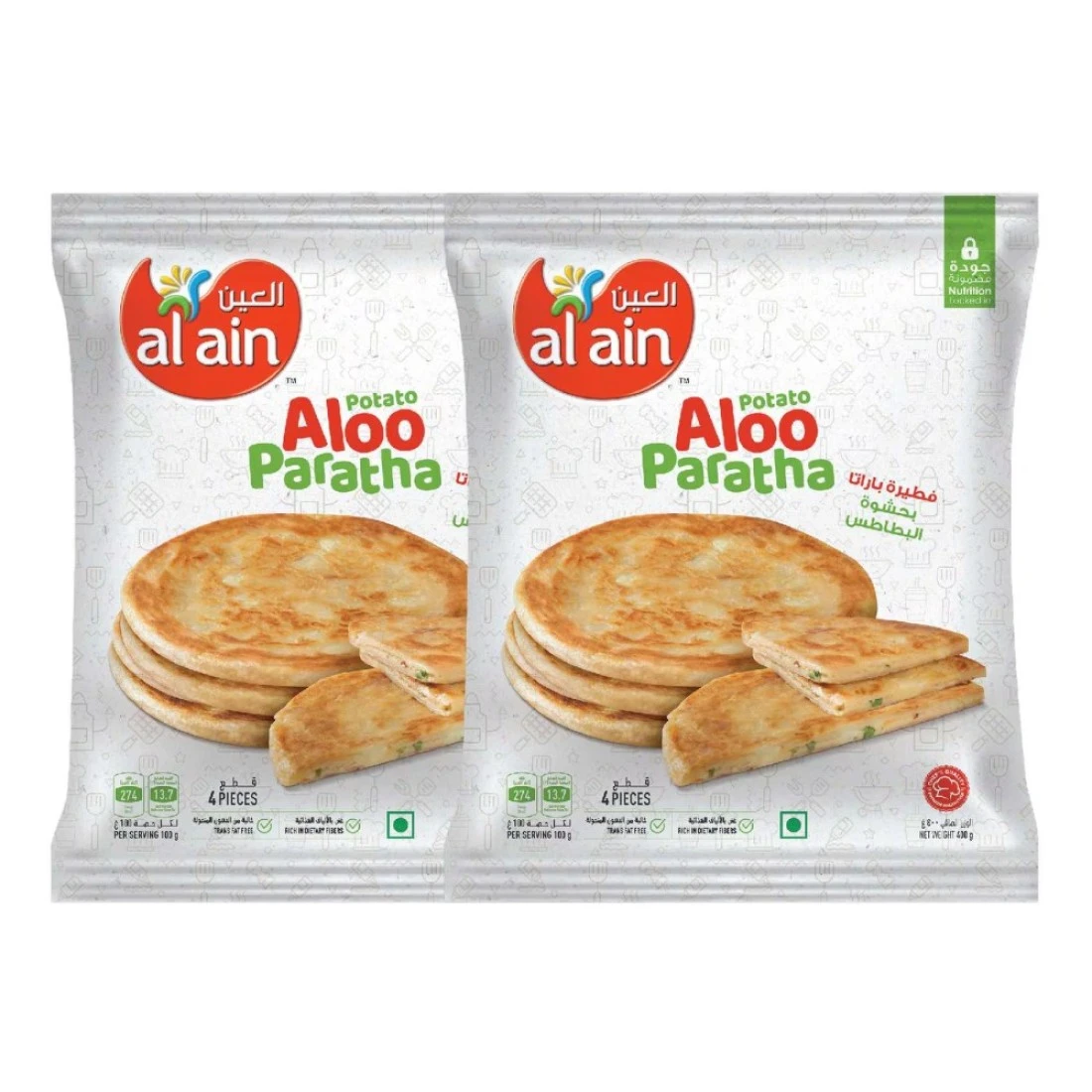 Al Ain Aloo Paratha is a delicious and convenient frozen meal option, featuring two perfectly crafted parathas filled with a savoury potato mixture. Each 400g pack contains two generously sized parathas, ideal for a quick breakfast, snack, or light meal. Made with high-quality ingredients, these flaky, golden-brown parathas are easy to prepare—simply heat them on a skillet or in the oven for a satisfying, authentic taste of Indian cuisine. Enjoy them on their own or paired with yogurt or chutney for an extra burst of flavour. Perfect for busy lifestyles, Al Ain Aloo Paratha brings the taste of home-cooked comfort to your table in minutes.