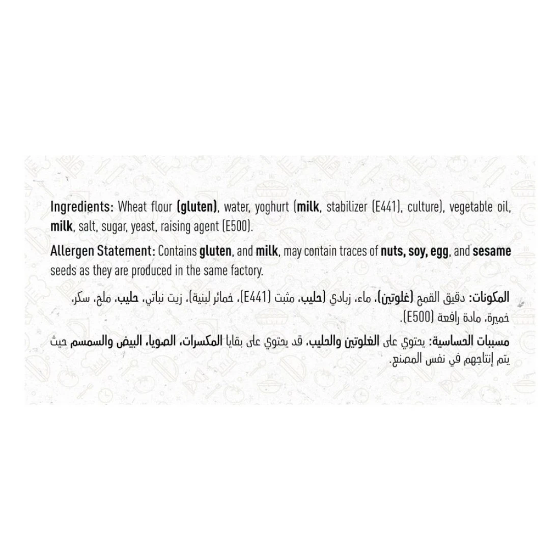 ingredients : Wheat Flour (Gluten), Water, Yoghurt (Milk, Stabilizer (E441), Culture), Vegetable Oil. Milk, Salt, Sugar, Yeast, Raising Agent (E500)