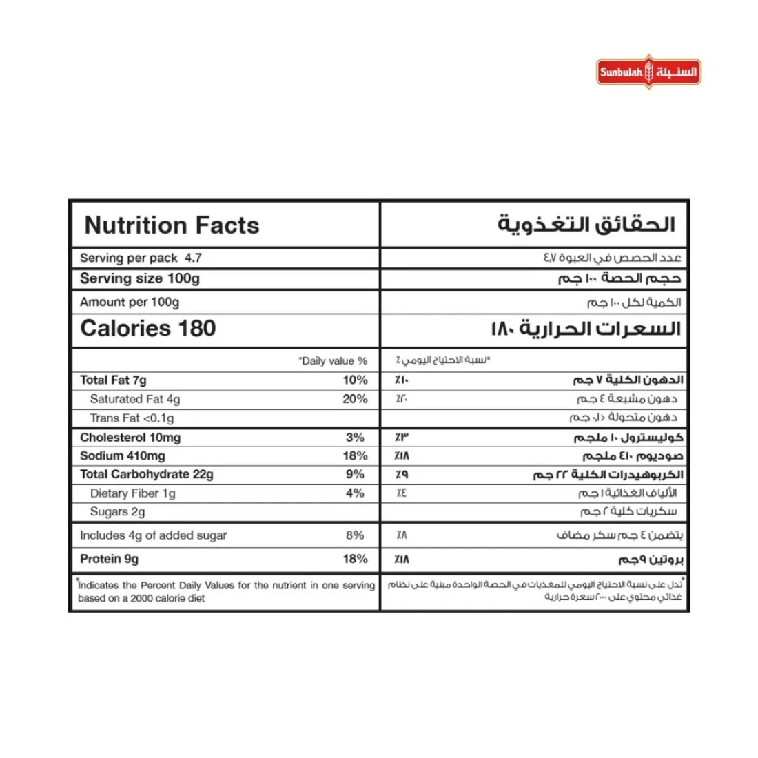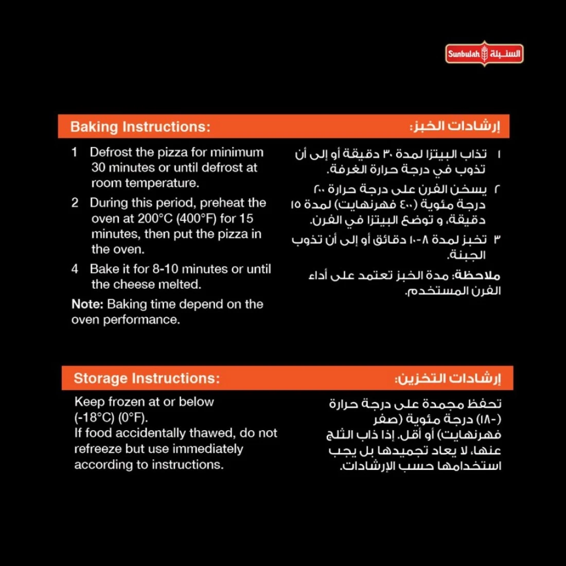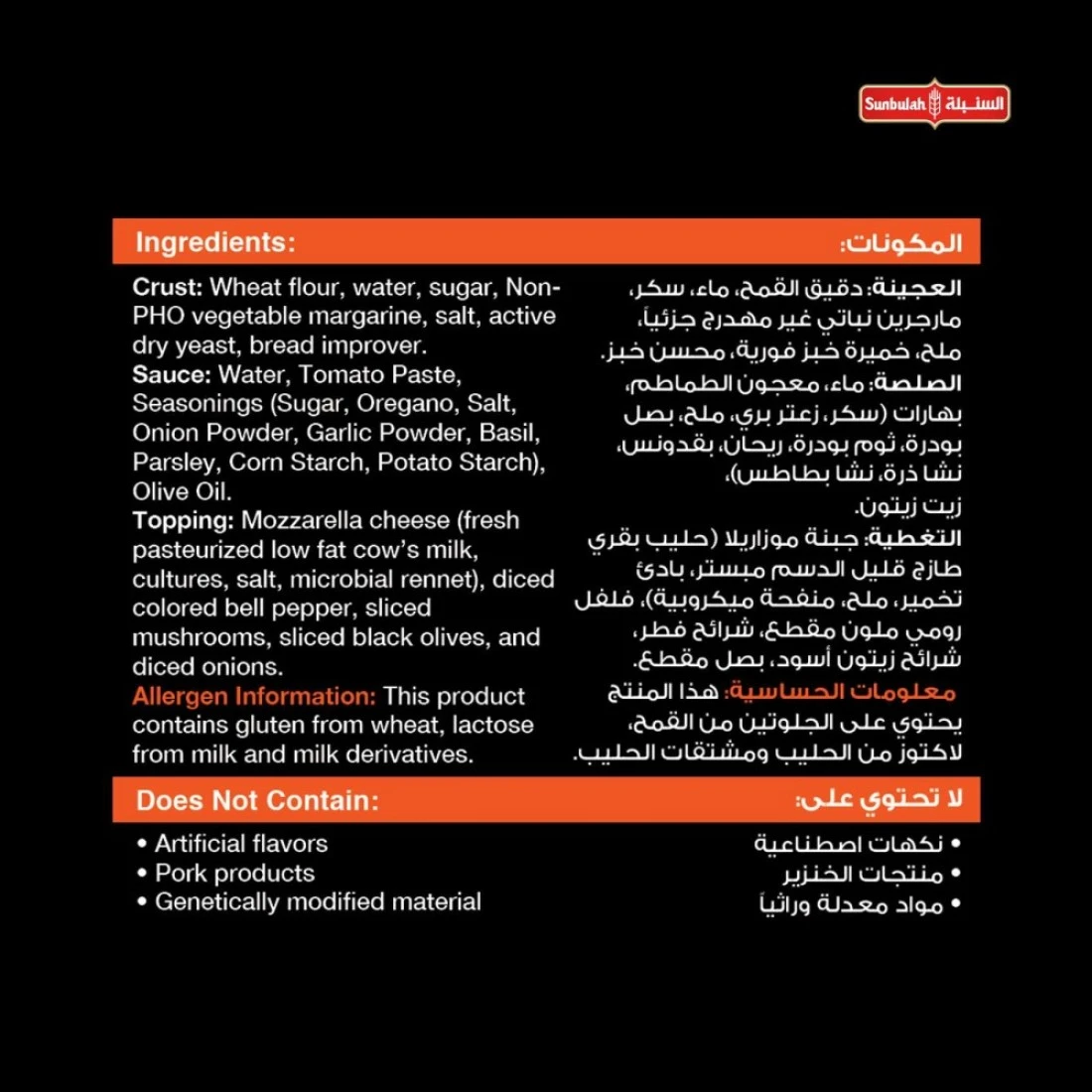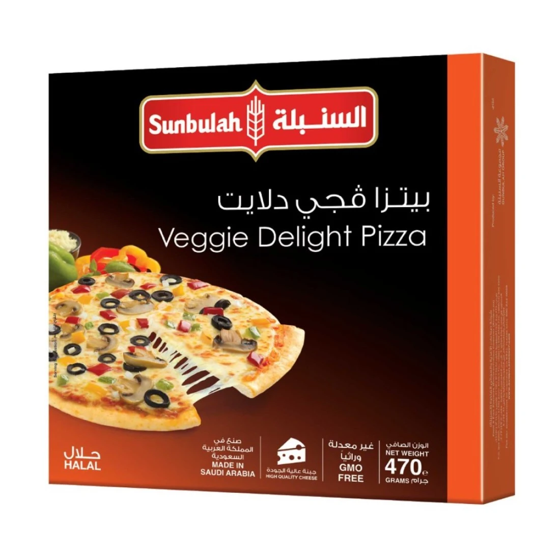 Sunbulah Veggie Delight Pizza is a delicious and healthy option for those looking for a meat-free meal. Made with a thin and crispy crust, this pizza is topped with a variety of fresh vegetables, including bell peppers, onions, mushrooms, and olives. The combination of flavours and textures is sure to satisfy your taste buds. Each bite of Sunbulah Veggie Delight Pizza is packed with nutrients and vitamins, making it a great choice for a balanced meal. Whether you're a vegetarian or just looking to add more plant-based options to your diet, this pizza is a tasty and convenient option. It's easy to prepare and perfect for a quick and satisfying dinner. With its generous portion size of 470g, Sunbulah Veggie Delight Pizza is perfect for sharing with friends or enjoying as a meal on your own. The tag on the packaging ensures that the pizza stays fresh and flavourful until you're ready to enjoy it. So go ahead and indulge in this delicious and guilt-free pizza option.