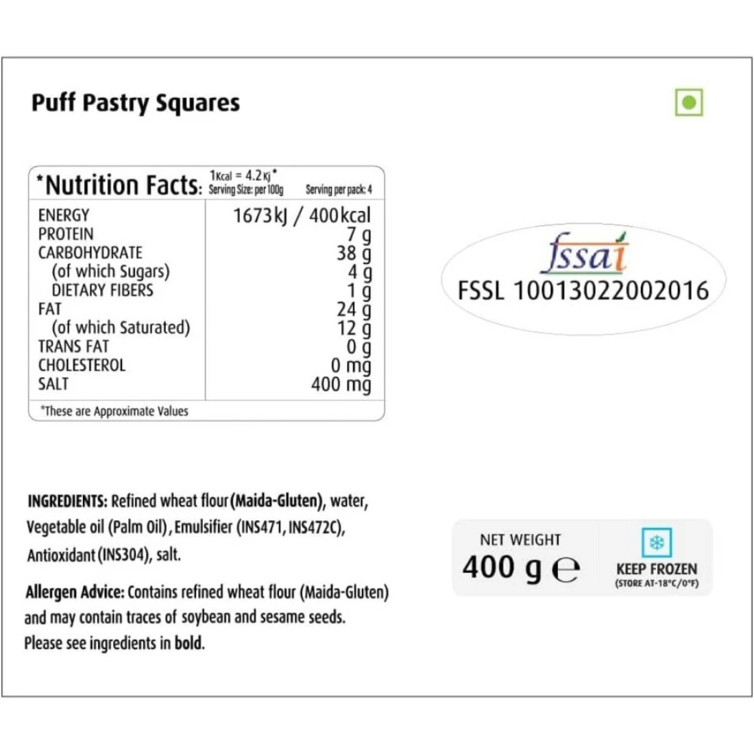 Switz Premium Puff Pastry Squares are a delicious and versatile addition to any kitchen. Made with high-quality ingredients, these puff pastry squares are light, flaky, and buttery. They can be used to create a variety of sweet and savoury dishes, from appetizers to desserts. Whether you're making a classic beef Wellington or a simple fruit tart, these puff pastry squares will elevate your dish to the next level. Each pack of Switz Premium Puff Pastry Squares contains 6 squares, each weighing 400g. This generous portion allows you to create multiple dishes or to stock up for future baking projects. The squares are conveniently pre-cut, saving you time and effort in the kitchen. Simply thaw, fill, and bake for a delicious and impressive result. Switz is a trusted brand known for its commitment to quality and taste. Their Premium Puff Pastry Squares are no exception. Made with care and attention to detail, these squares are sure to impress even the most discerning palate. Whether you're a professional chef or a home cook, Switz Premium Puff Pastry Squares are a must-have in your pantry.