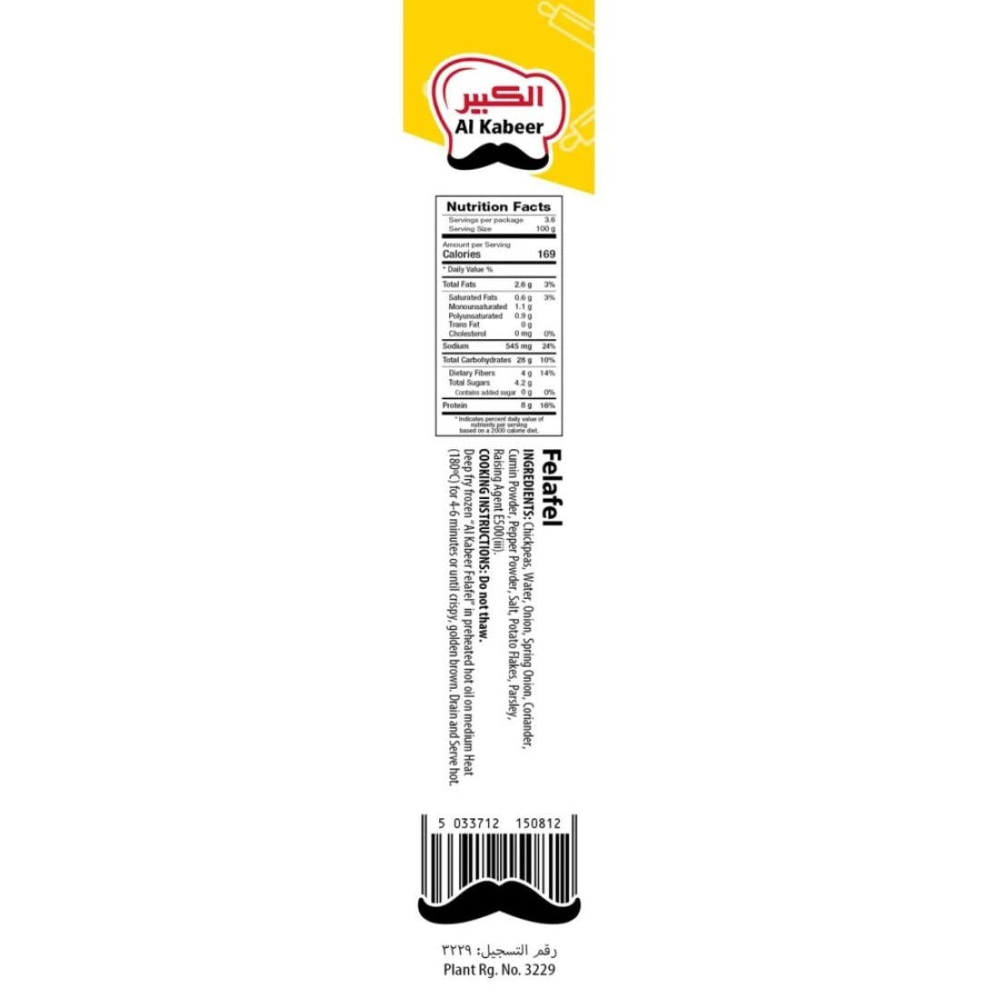 Al Kabeer Falafel is a delicious Middle Eastern snack that is loved by people all over the world. Made from a mixture of ground chickpeas, herbs, and spices, these falafels are crispy on the outside and soft on the inside. They are perfect for stuffing in pita bread with tahini sauce, fresh vegetables, and pickles for a quick and satisfying meal. The Al Kabeer Falafel comes in a convenient 360g pack, making it easy to store in the freezer and enjoy whenever you have a craving for this tasty treat. Whether you're a vegetarian looking for a protein-packed meal or a meat lover wanting to try something different, these falafels are sure to satisfy your taste buds. With Al Kabeer Falafel, you can enjoy the authentic flavours of the Middle East in the comfort of your own home. Simply heat them in the oven or fry them in a pan until they are golden brown and crispy. Serve them as an appetizer, snack, or main course, and impress your family and friends with your culinary skills. So why wait? Try Al Kabeer Falafel today and experience the taste of the Mediterranean!