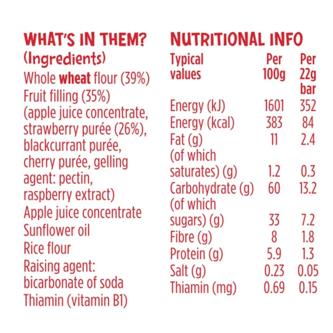 ingredients : Fruit Filling (35%) (Apple Juice Concentrate, Strawberry Puree (26%), Blackcurrant Puree, Cherry Puree, Gelling Agent: Pectin, Raspberry Extract), Apple Juice Concentrate, Sunflower Oil, Rice Flour, Raising Agent: Bicarbonate Of Soda, Thiamin (Vitamin B1).