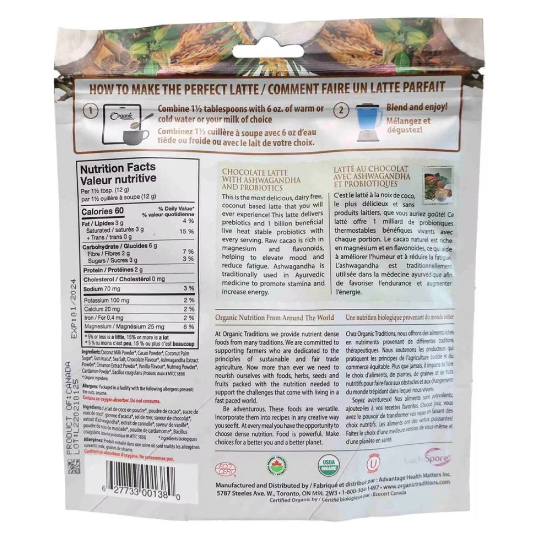 ingredients : Organic Coconut Milk Powder, Organic Cacao Powder, Organic Coconut Palm Sugar, Organic Gum Acacia, Sea Salt, Organic Chocolate Flavour, Organic Ashwagandha Extract Powder, Organic Cinnamon Extract Powder, Organic Vanilla Flavour, Organic Nutmeg Powder, Organic Cardamom Powder, Bacillus Coagulans