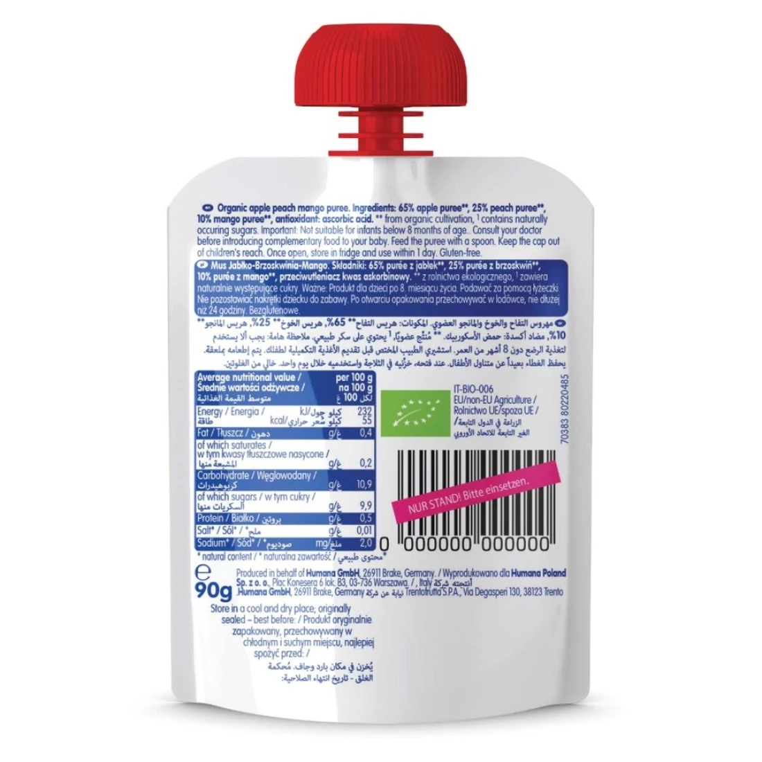 Humana Peach Mango and Banana Puree is a nutritious baby food that provides a delicious blend of peaches mangoes and bananas. This ready-to-eat puree is made from high-quality fruits and is perfect for introducing your baby to new flavours and textures. It is packed with vitamins and minerals that contribute to the healthy growth and development of your little one. The convenient 90g pouch is easy to carry and can be enjoyed at home or on the go. With no added sugars or artificial flavours, Humana Peach Mango and Banana Puree are a wholesome choice for your baby's diet.