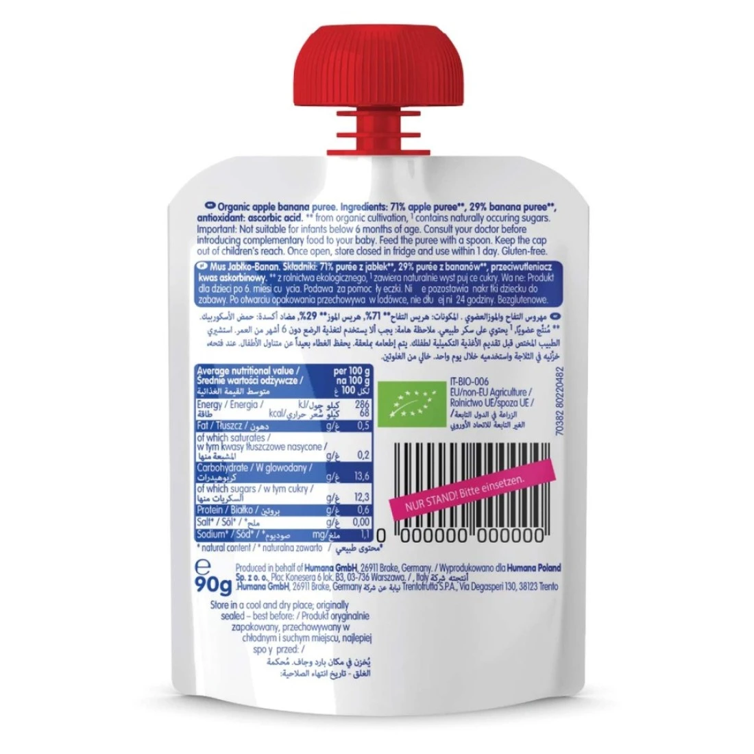 - This Humana fruit pouch offers a delicious blend of fruits and vegetable puree and is the perfect pouch to start the weaning adventure