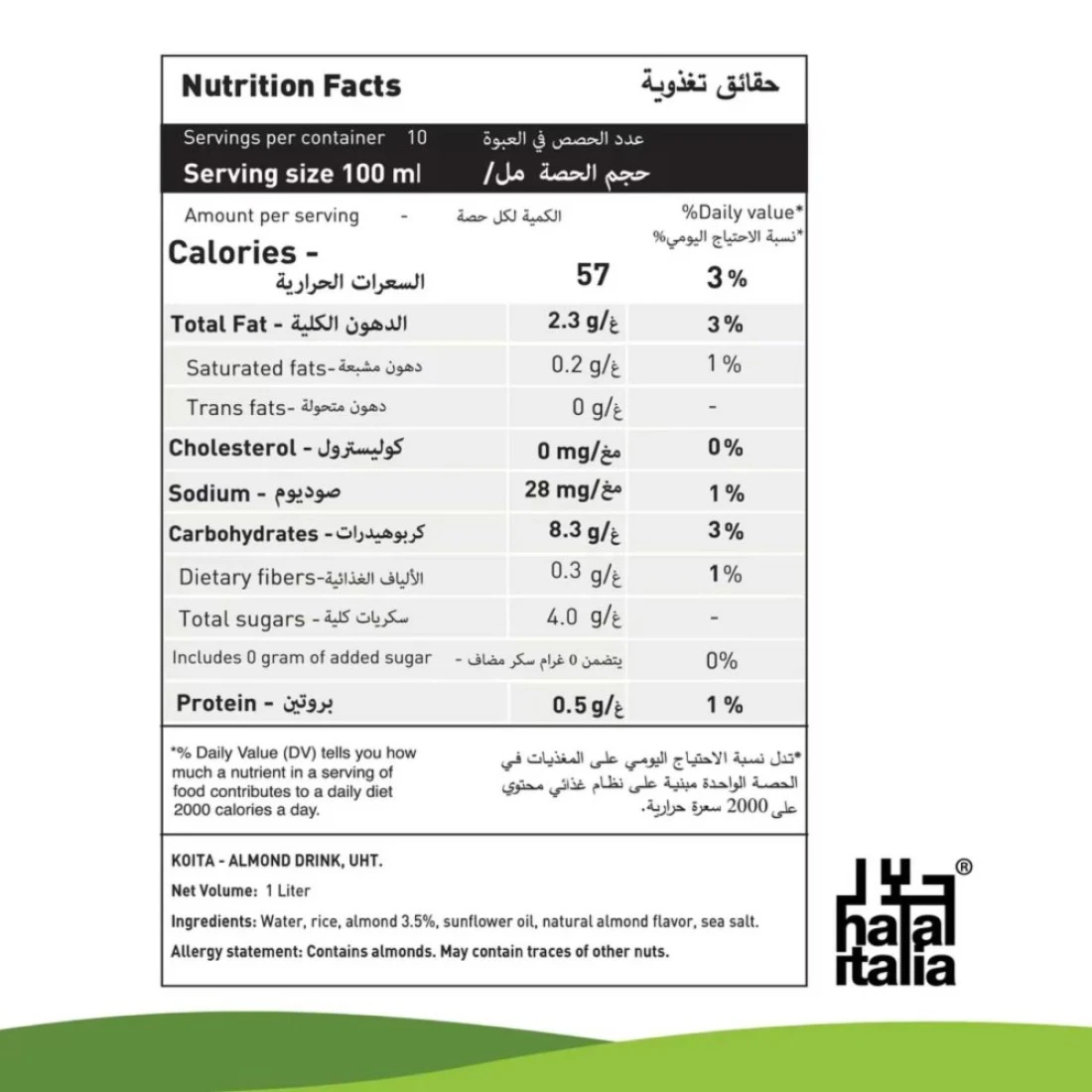 ingredients : Water, rice, almond (3.5%), sunflower oil, natural almond flavor, sea salt.Allergy Statement:Contains almonds. May contain traces of other nuts.