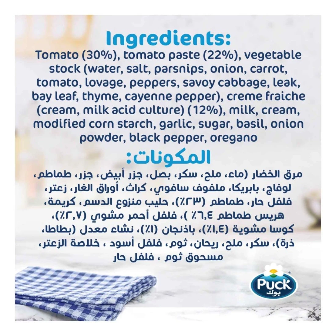 ingredients : Tomato (30%), Tomato Paste (22%), Vegetable Stock (Water, Salt, Parsnips, Onion, Carrot, Tomato, Lovage, Peppers, Savoy Cabbage, Leak, Bay Leaf, Thyme, Cayenne Pepper), Creme Fraiche (Cream, Milk Acid Culture) (12%), Milk, Cream, Modified Corn Starch, Garlic, Sugar, Basil, Onion Powder, Black Pepper, Oregano