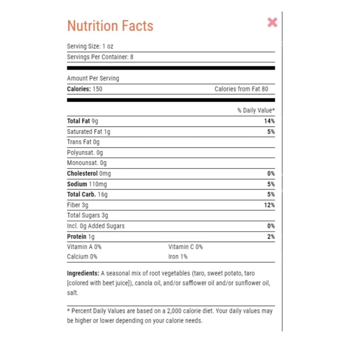 ingredients : A Seasonal Mix Of Root Vegetables (Taro, Sweet Potato, Batata, Yuca, Parsnip)74%, Edible Vegetable Oil (Canola Seed and Or Safflower Seed and Or Sunflower Seed), Sea Salt, Colourant (Beet Juice Concentrate)