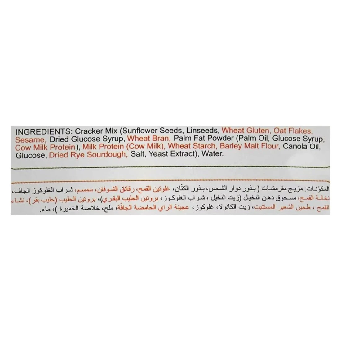 ingredients : Sunflower Seeds, Linseeds, Wheat Gluten, Oat Flakes, Sesame Seeds, Dried Glucose Syrup, Wheat Bran, Palm Fat Powder (Palm Oil, Glucose Syrup, Cow Milk Protein), Milk Protein (Cow Milk), Wheat Starch, Barley Malt Flour, Canola Oil, Glucose. Dried Rye Sourdough, Salt, Yeast Extract, Water. Wheat Bran, Palm Fat Powder (Palm Oh, Glucose Syrup, Cow Milk Protein), Milk Protein (Cow Milk), Wheat Starch, Barley Malt Flour, Canola Oil, Glucose, Dried Rye Sourdough, Salt, Yeast Extract, Water. Sunflower Seeds, Linseeds, Wheat Gluten, Oat Flakes, Sesame Seeds, Dried Glucose Syrup, Wheat Bran, Palm Fat Powder (Palm Oh, Glucose Syrup, Cow Milk Protein), Milk Protein (Cow Milk), Wheat Starch, Barley Malt Flour, Canola Oil, Glucose, Dried Rye Sourdough, Salt, Yeast Extract and Water.