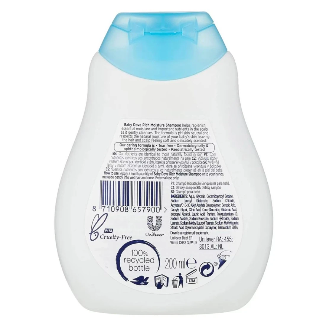 Dove Baby Rich Moisture Shampoo is a gentle, nourishing formula designed specifically for the delicate hair and scalp of babies. Packaged in a convenient 200ml bottle, this shampoo is enriched with moisturizing ingredients that help to hydrate and soften hair, leaving it clean and manageable. Its mild, tear-free formula ensures a comfortable bathing experience, making it suitable for daily use. Free from harsh chemicals, parabens, and sulfates, Dove Baby Rich Moisture Shampoo is perfect for parents seeking a safe and effective option for their little ones' hair care routine.