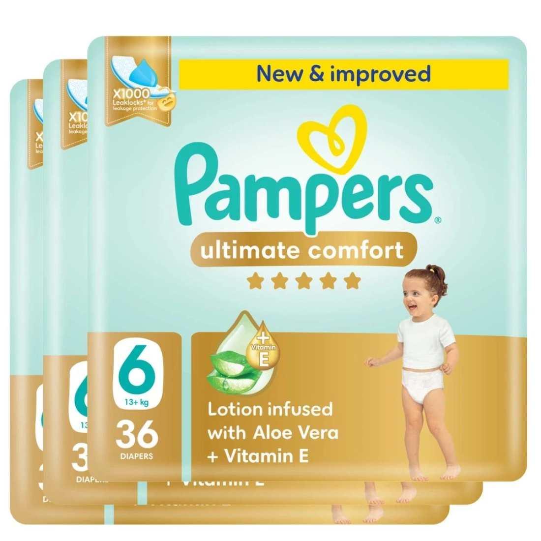 Pampers Ultimate Comfort Diapers with Aloe Vera Plus Vitamin E Size 6 13kg+ Mega Pack 36 Diapers Pack of 3