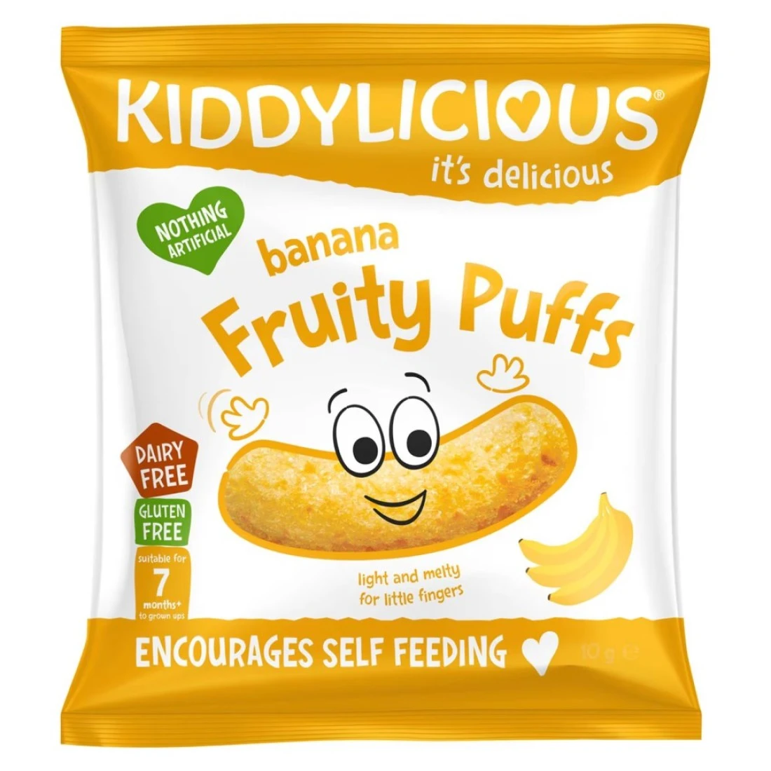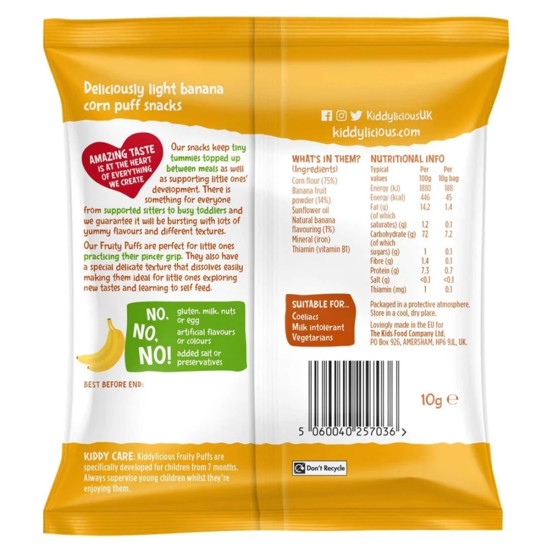 Kiddylicious Banana Fruity Puffs are a delicious and healthy snack packed with real banana flavour. These 10g bite-sized puffs are perfect for little hands and provide a fun and crunchy texture that toddlers will love. Made with all-natural ingredients, these puffs are a nutritious alternative to sugary snacks and are great for on-the-go munching.