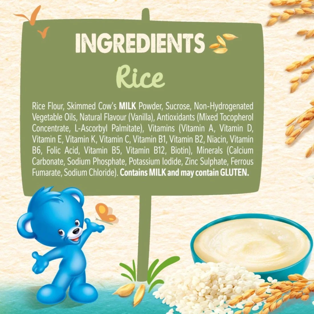 ingredients : Rice, Skimmed Cow's Milk, Non-hydrogenated Vegetable Oils, Sucrose, Natural Vanilla Flavour, Minerals (Calcium Carbonate, Ferrous Fumarate, Zinc Sulfate, Potassium Iodide), Vitamins (Vitamin C, Niacin, Vitamin E, Vitamin B1, Pantothenic Acid, Vitamin A, Vitamin K, Vitamin B6, Folic Acid, Biotin, Vitamin D)