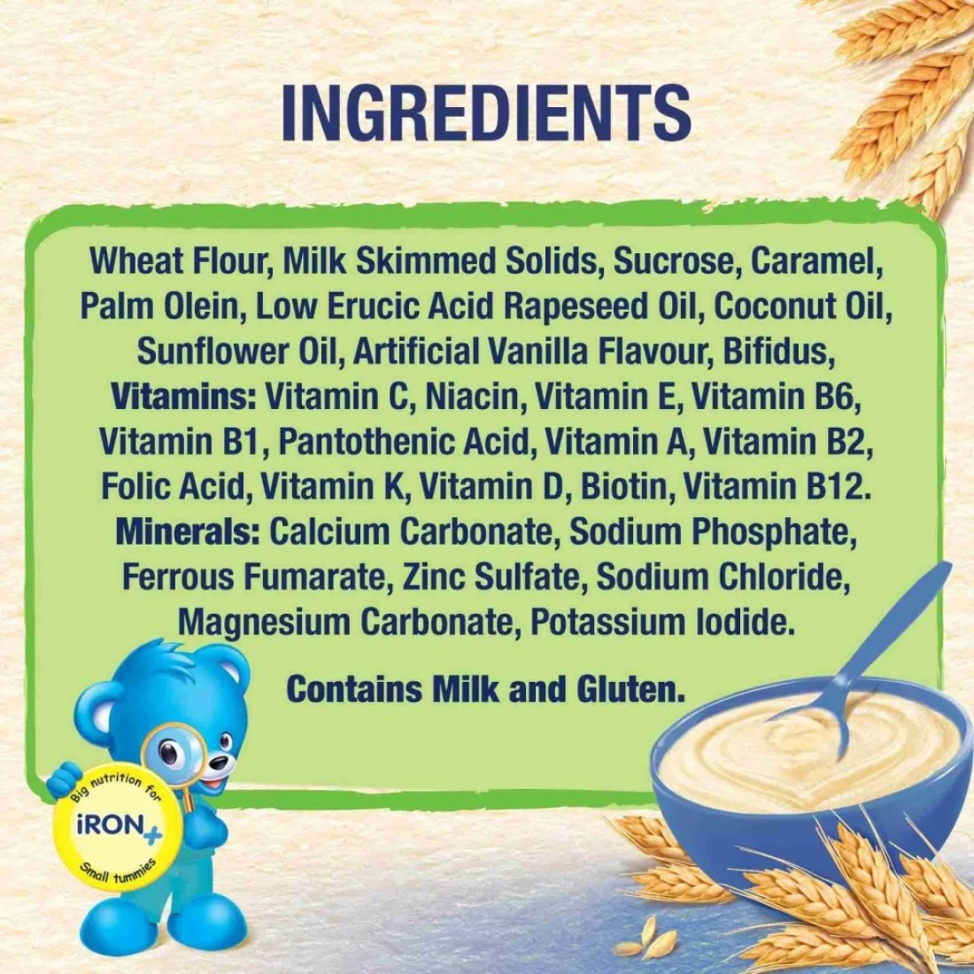 ingredients : Wheat Flour, Dried Skimmed Cow's Milk, Sucrose, Non-hydrogenated Vegetable Oils, Natural Flavour (Vanilla), Vitamins (Vitamin C, Niacin, Vitamin E, Vitamin B1, Pantothenic Acid, Vitamin A, Vitamin B6, Vitamin K, Folic Acid, Biotin, Vitamin D), Minerals (Ferrous Fumarate, Calcium Carbonate, Zinc Sulfate, Potassium Iodide)