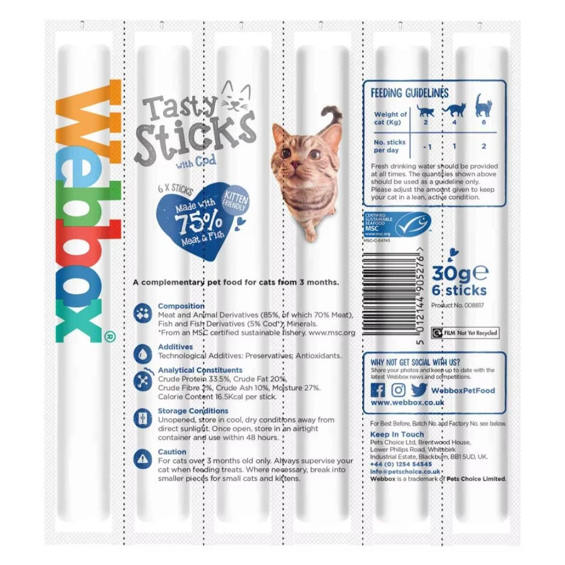 Webbox Cod With Tasty Cat Sticks is a delicious treat for your feline friend. Made with real cod these cat sticks are packed with protein and essential nutrients. They are carefully oven-roasted to lock in the flavour and provide an irresistible taste that cats love. These cat sticks are also a great way to promote dental health as they help to reduce tartar build-up. Treat your cat to these tasty cat sticks and watch them purr with delight. Each pack contains 30g of cat sticks.