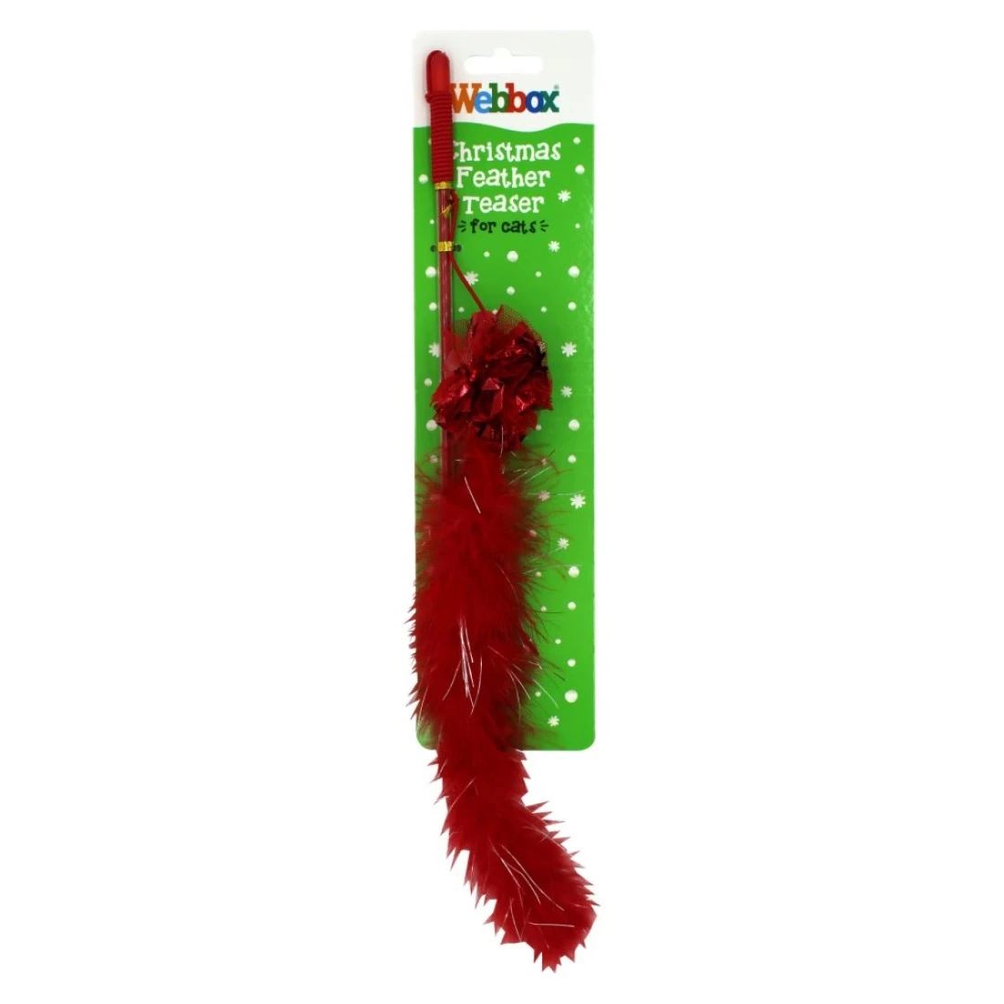 The Webbox Christmas Feather Teaser Wand is a fun and festive toy for cats during the holiday season. This wand features a red handle and a long string with a feather attached at the end which will entice your cat to play and chase. It is a great way to entertain and exercise your cat while also spreading some Christmas cheer. The wand is lightweight and easy to use making it a perfect gift for your feline friend this Christmas.