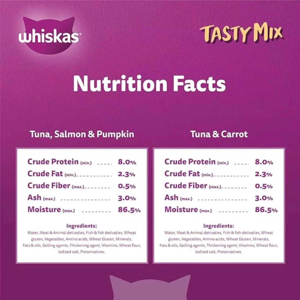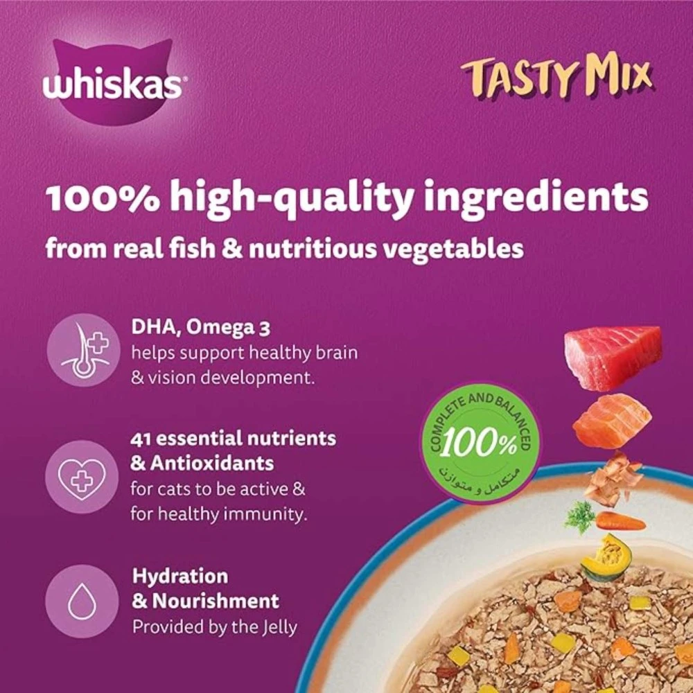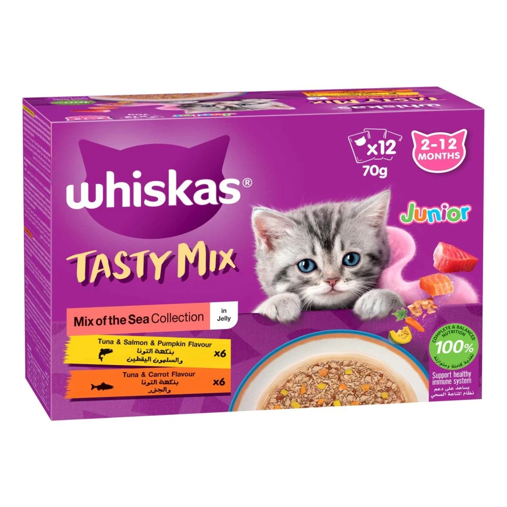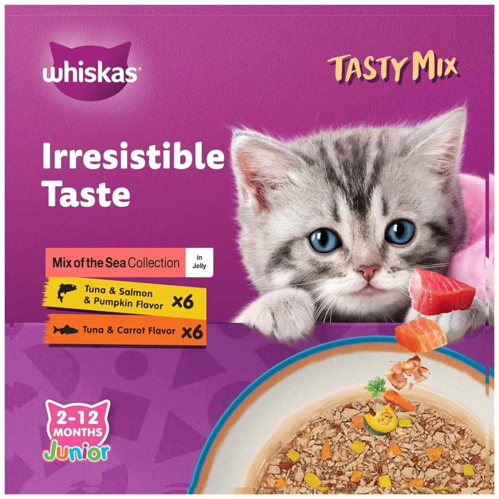 - Whiskas Tasty Mix of the Sea Collection in Jelly provides essential nutrients for growing kittens aged 2 to 12 months, ensuring optimal health and development