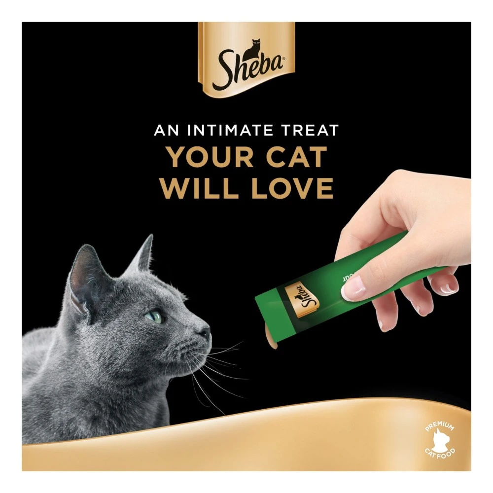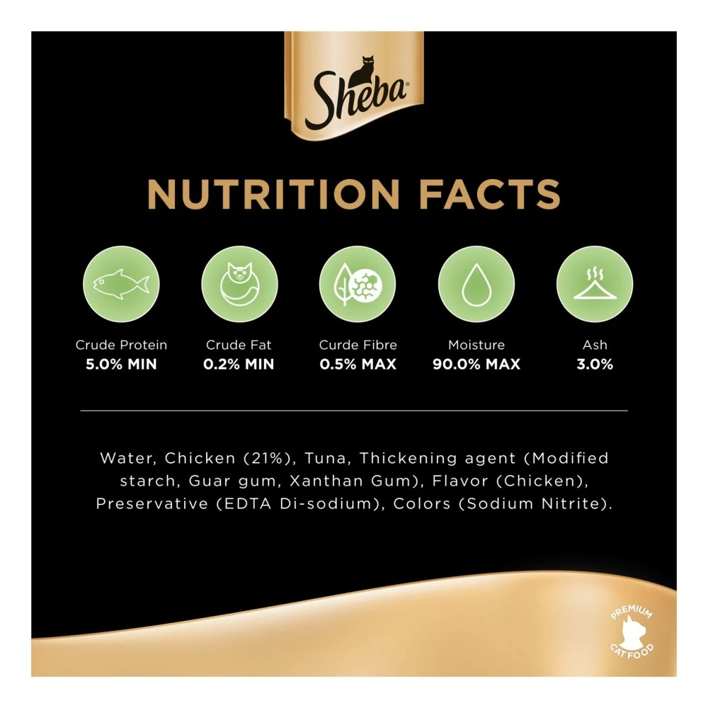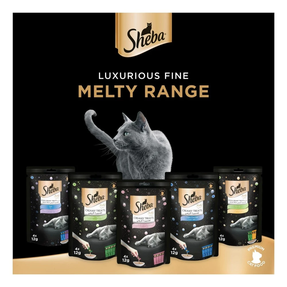 - PREMIUM RANGE OF FLAVORS: Sheba cat food melty treats offers your cat a Premium Selection in three variants, Chicken, Tuna, and Tuna & Salmon, for them to enjoy. Because Love means never having to say leftovers.