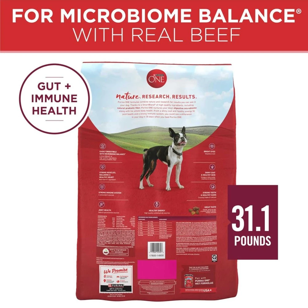 Purina ONE formulas combine nature and research for results you can see in your dog. Thanks to a SmartBlend® of high-quality ingredients, including natural prebiotic fiber, Purina ONE nurtures your dog's digestive microbiome along with his whole-body health. From a shiny coat and healthy energy to joint health and a strong immune system, you could see a difference in your dog in 28 days when you feed Purina ONE.