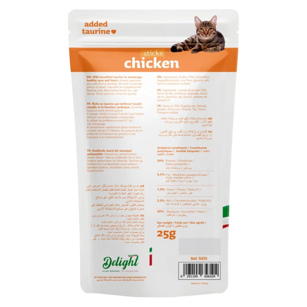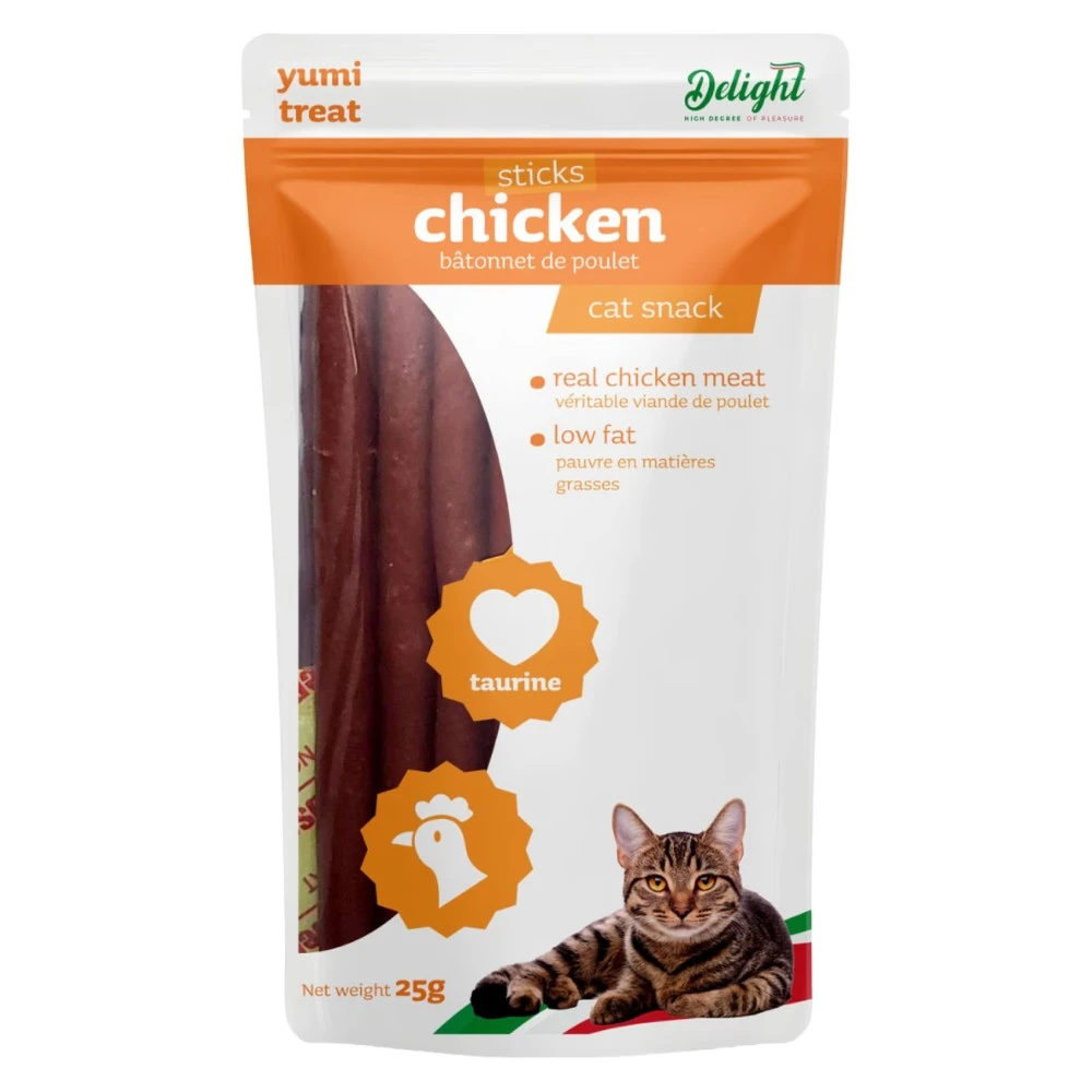 Delight Chicken Sticks Treats for cats are a delectable snack designed to satisfy your feline friend's cravings. Each 25g pack contains tender, chicken-flavoured sticks that are not only delicious but also easy to chew, making them perfect for cats of all ages. These treats are made with high-quality ingredients to ensure a tasty and nutritious reward. Delight Chicken Sticks are ideal for training or simply showing your cat some love, providing a delightful experience that will keep them coming back for more. Treat your cat to a flavourful snack that they will adore!