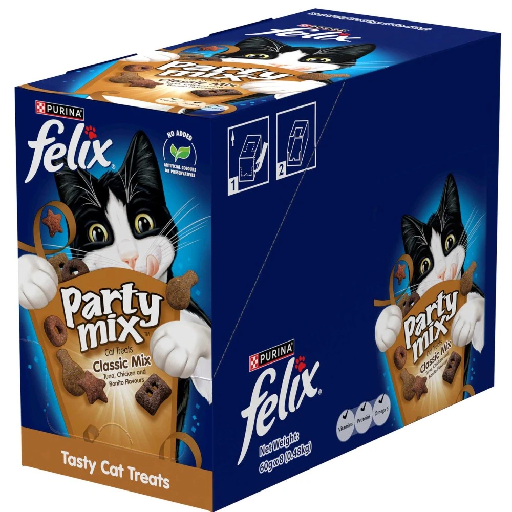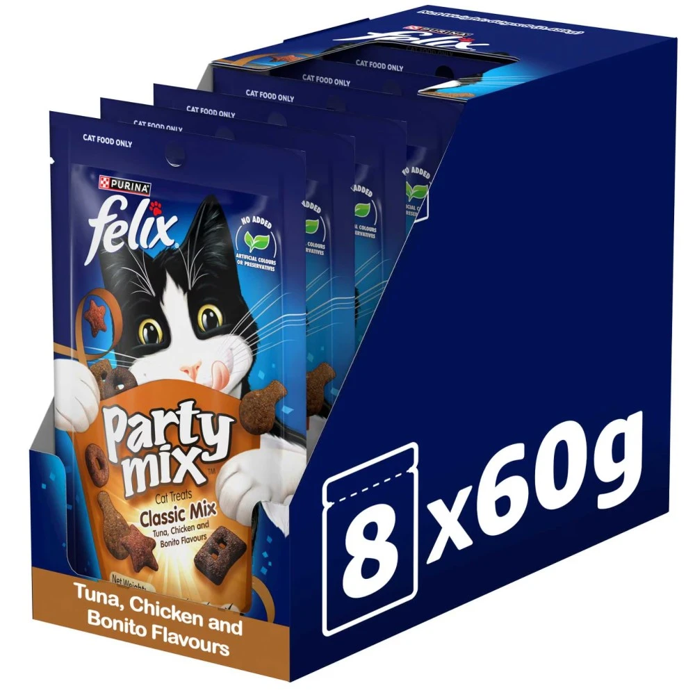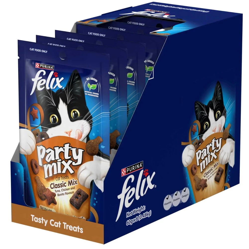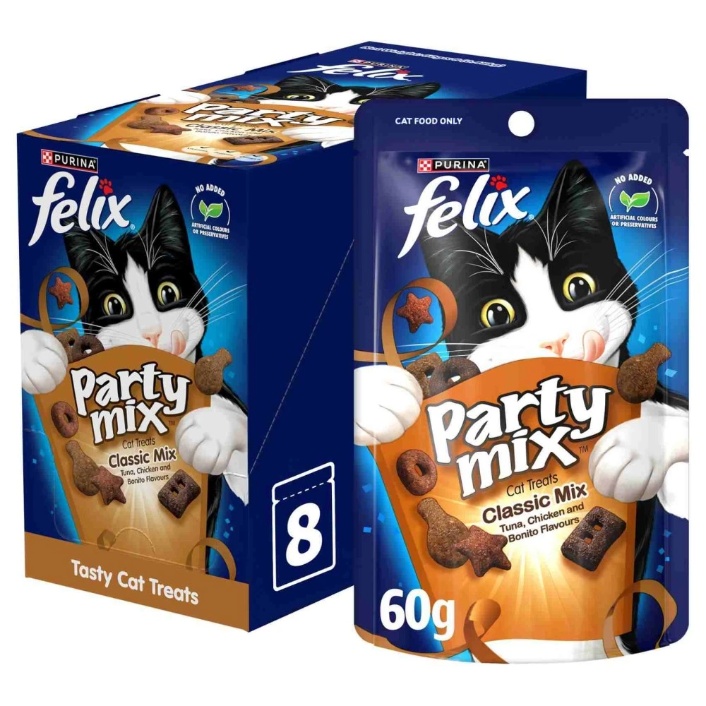Purina Felix Party Mix Classic Mix Dry Cat Treats, 60g Pack of 8
