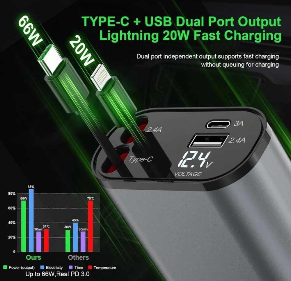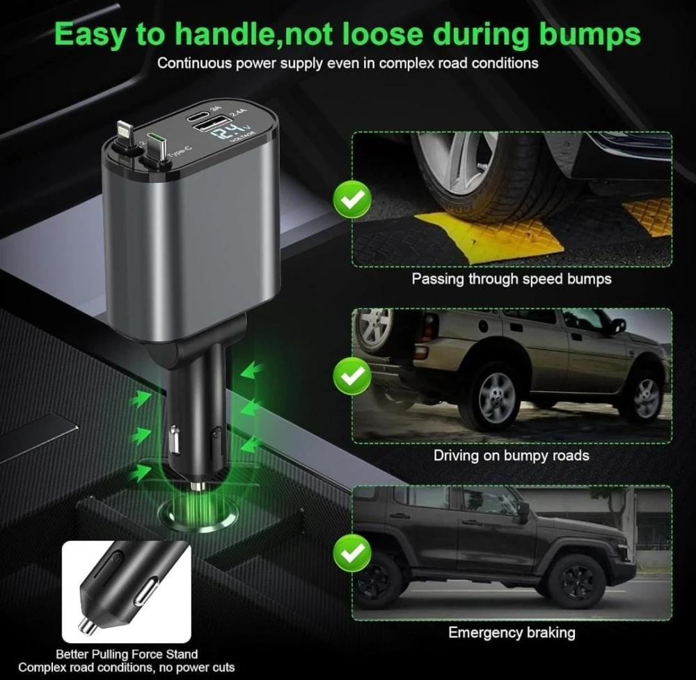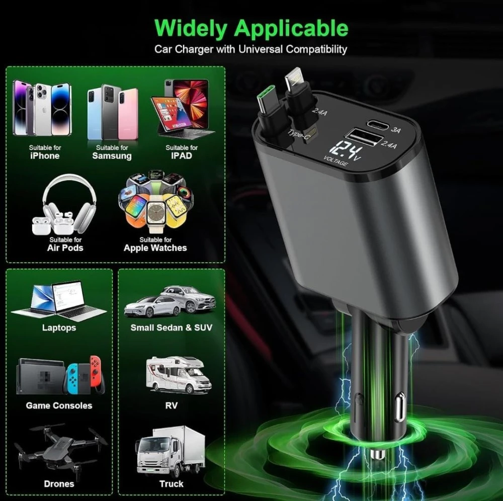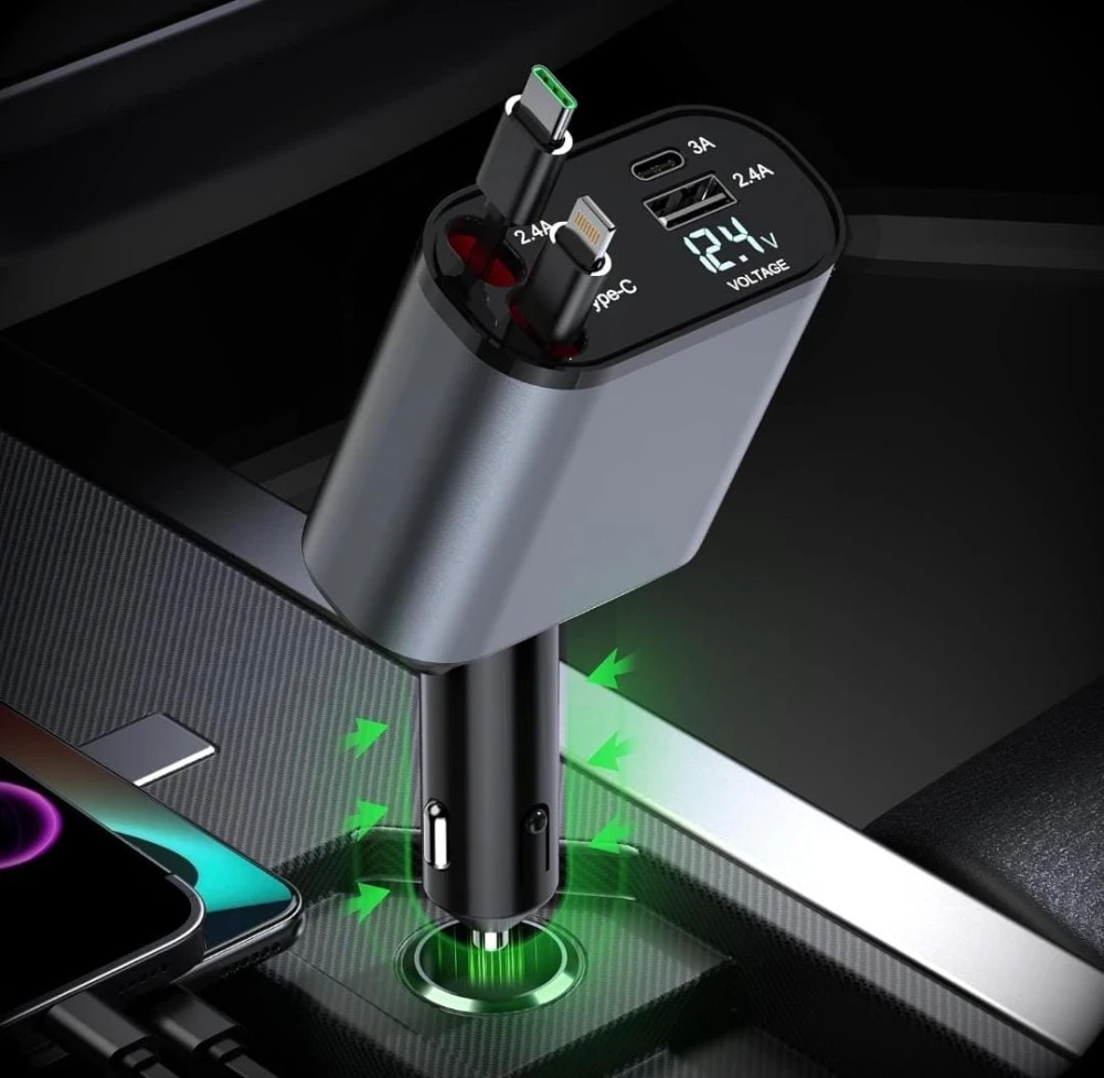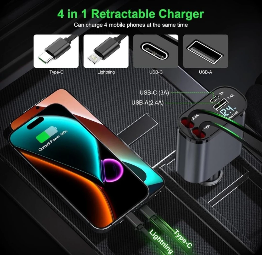4-in-1 Car Charger: Combines a retractable Type C cable, dual USB ports, and a voltage display for a comprehensive charging solution in your vehicle.