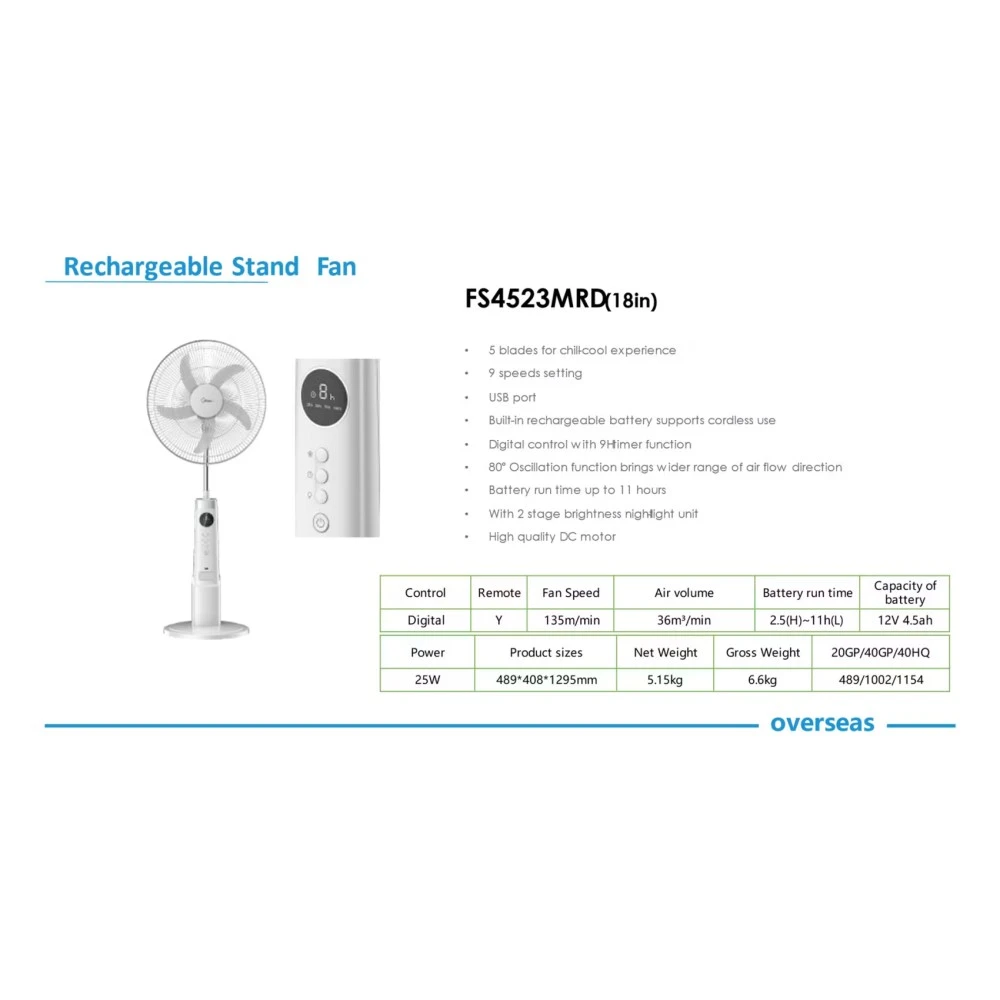 - Midea Rechargeable Stand Fan with Remote FS4523MRD is an 18-inch fan that offers powerful and efficient cooling