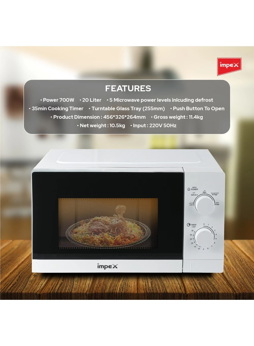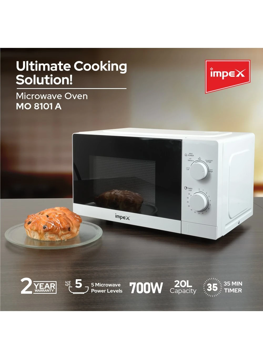 Impex 20L Microwave Oven - 700W Power, 5 Power Levels, 1100W Consumption, 2-Year Warranty, 50Hz/60Hz Frequency, Efficient Cooking Appliance with 20 Liters Capacity - MO 8101A