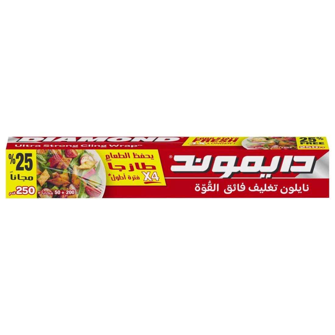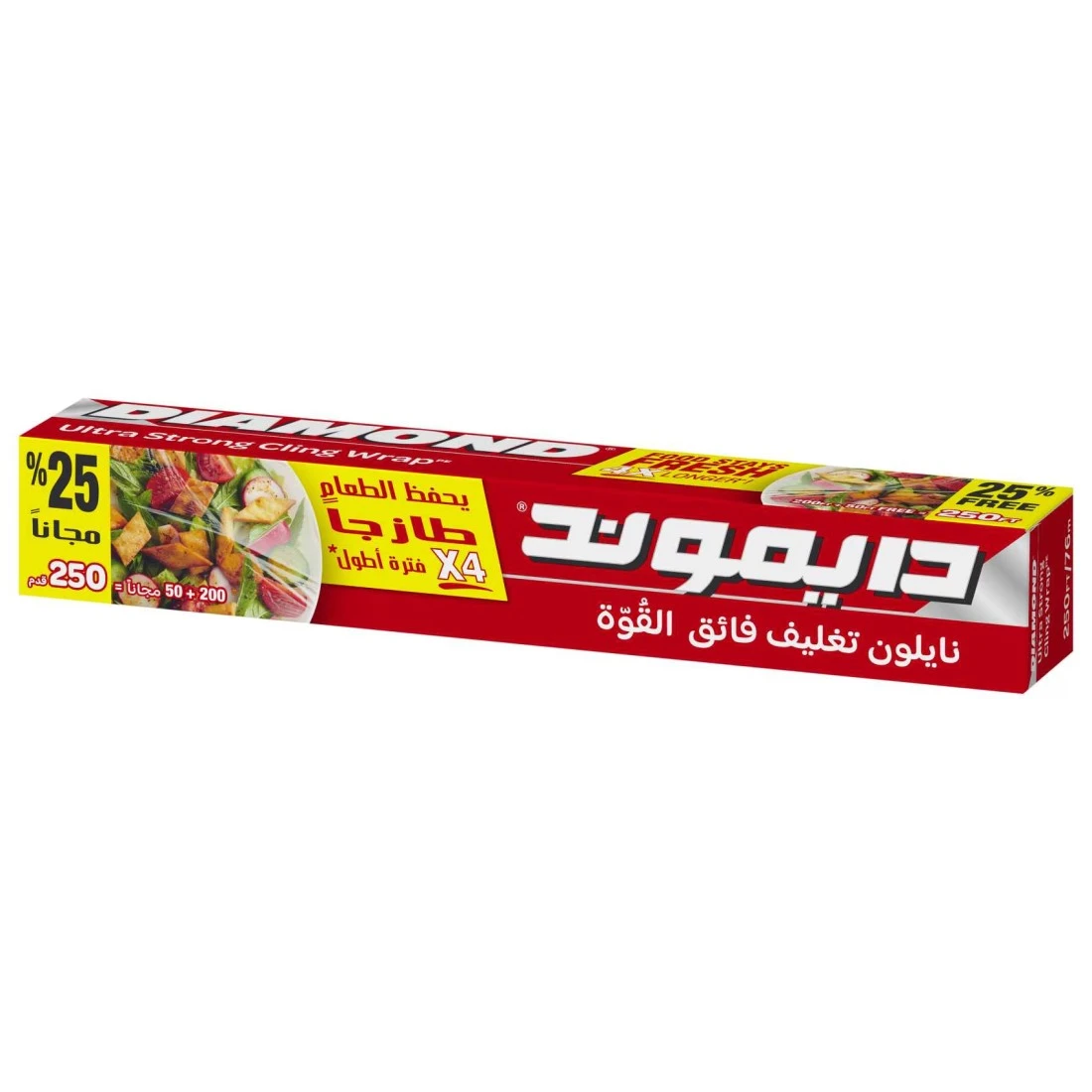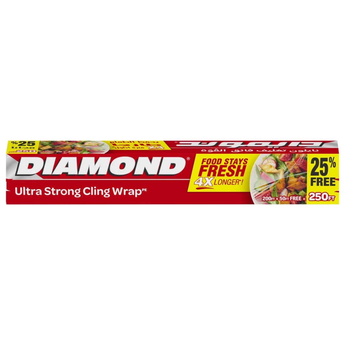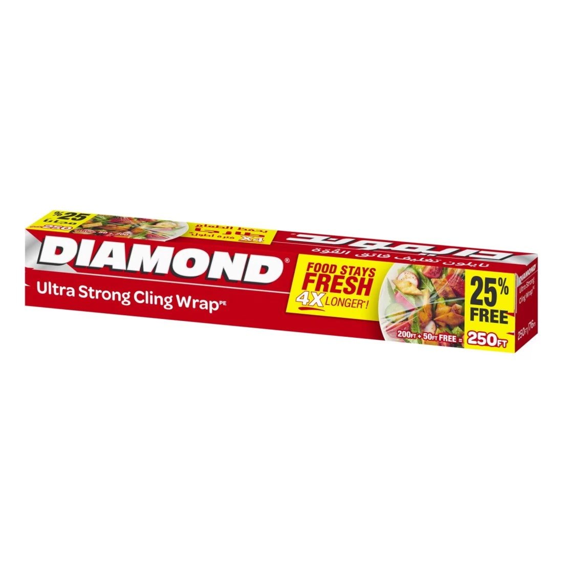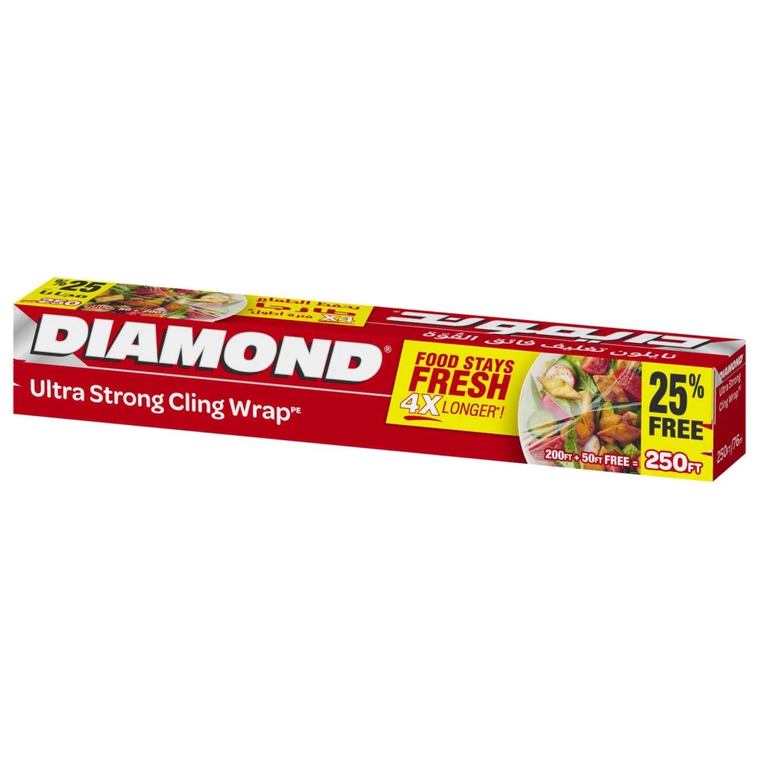 Diamond Cling Wrap is a high-quality plastic wrap that is perfect for wrapping sealing and preserving food. With its strong cling and durable construction it helps to keep food fresh and prevents leakage. The 250ft roll provides ample wrap for all your food storage needs. Whether you are packing leftovers prepping meals or storing fruits and vegetables Diamond Cling Wrap is a reliable choice.