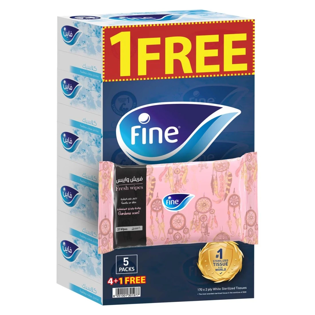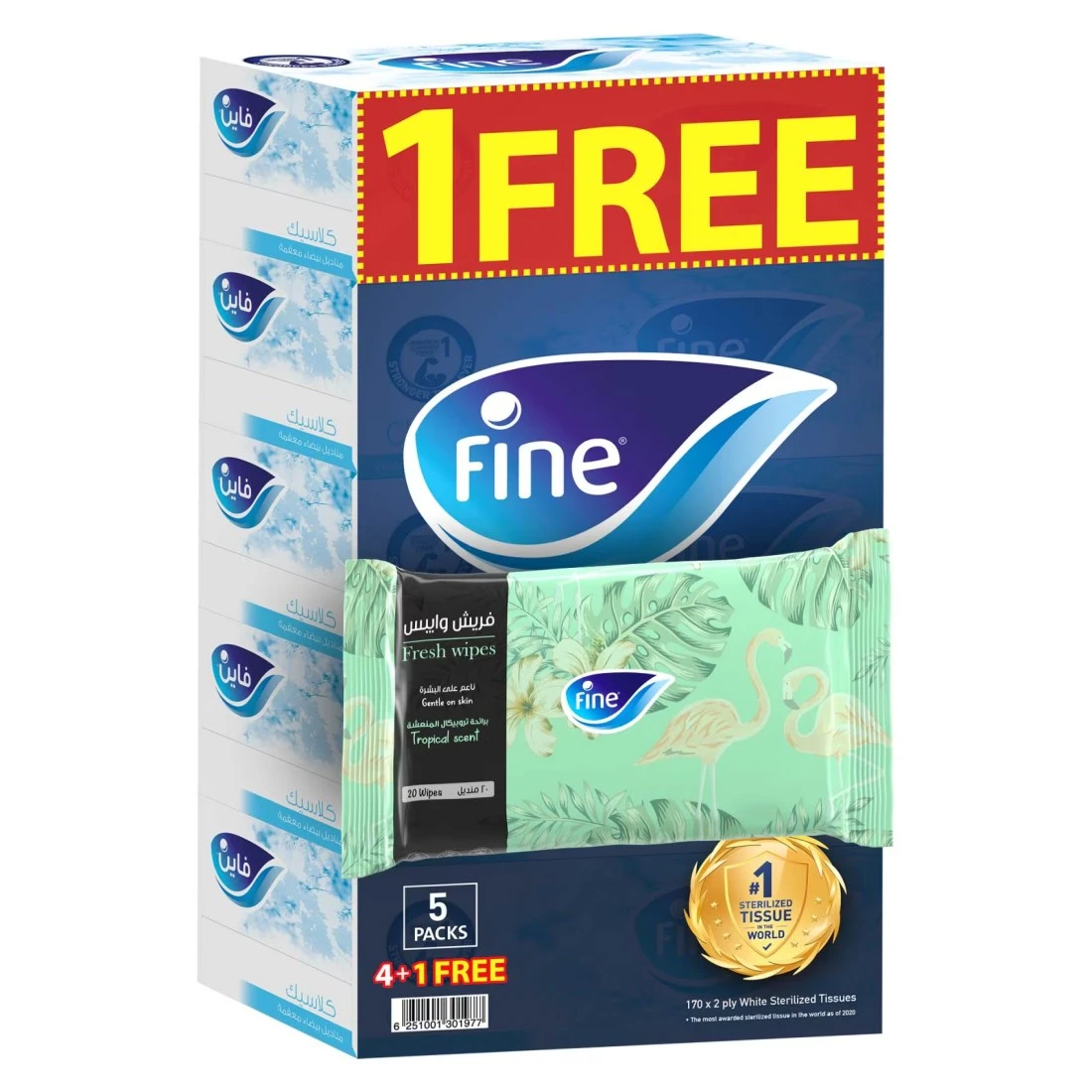 Fine Facial Tissue Box Pack of 5 and Fresh Wipes 20 Wipes