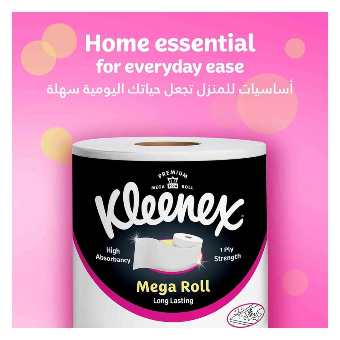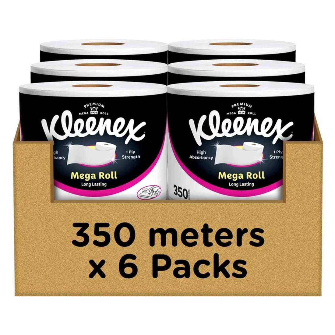 Kleenex Mega Kitchen Paper Towels are designed for maximum absorbency and strength, making them an essential addition to any kitchen. Each roll features 350 meters of high-quality paper, ensuring you have plenty of sheets to tackle spills, messes, and everyday cleaning tasks. The pack contains six rolls, providing long-lasting value and convenience. With a durable, tear-resistant design, these paper towels are perfect for both quick clean-ups and heavier-duty jobs, making them a reliable choice for households and kitchens of all sizes.