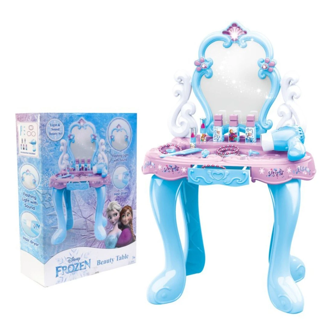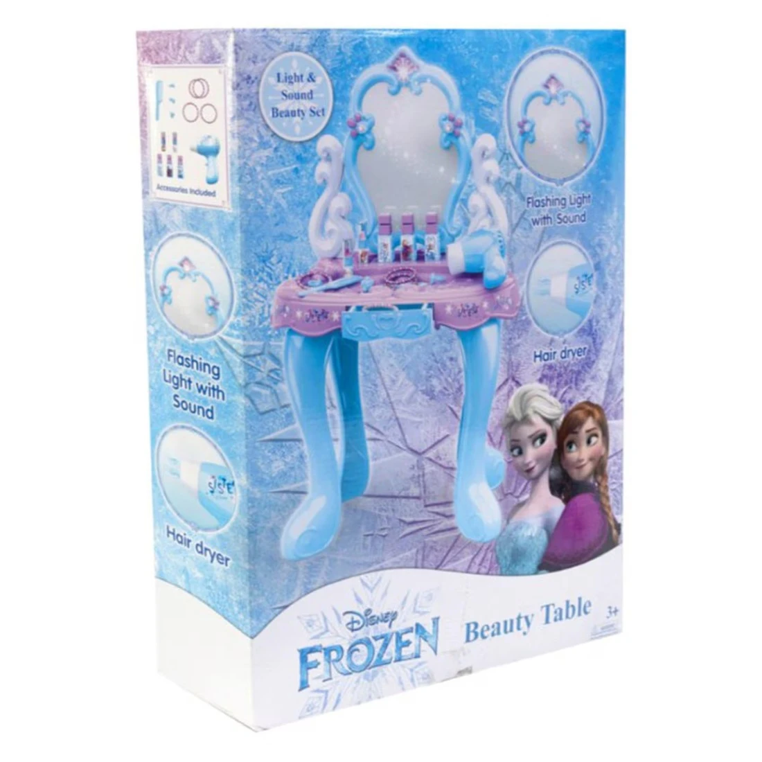 - Includes light-up mirror, hair dryer, and accessories