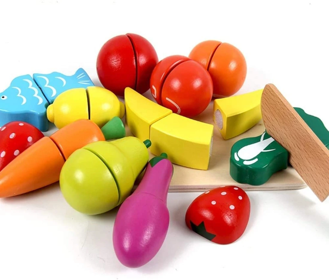 Toddlers and Kids Love to play shopping and pretend play slicing and cooking. This set with vivid colored cutting fruits, bucket, cutting board and wooden knife.