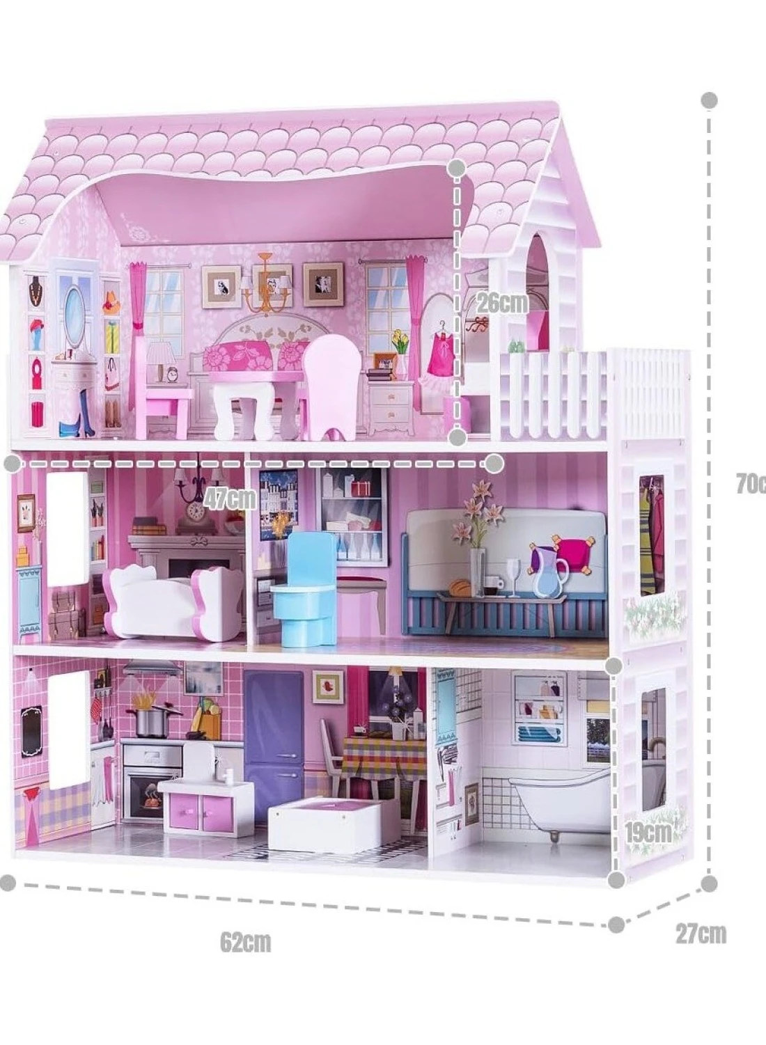 Spacious design with three levels and multiple rooms, offering endless pretend-play opportunities.