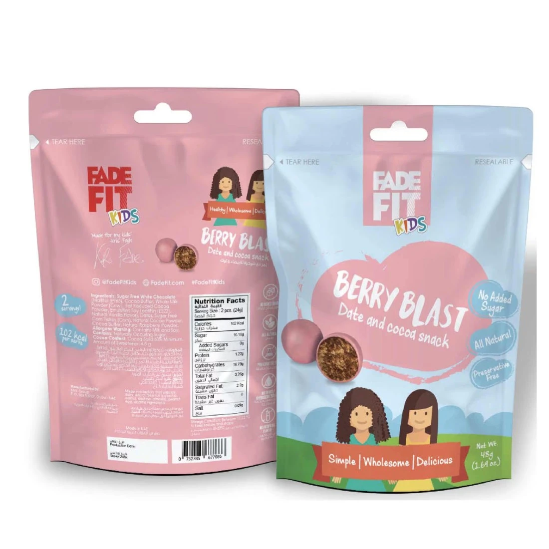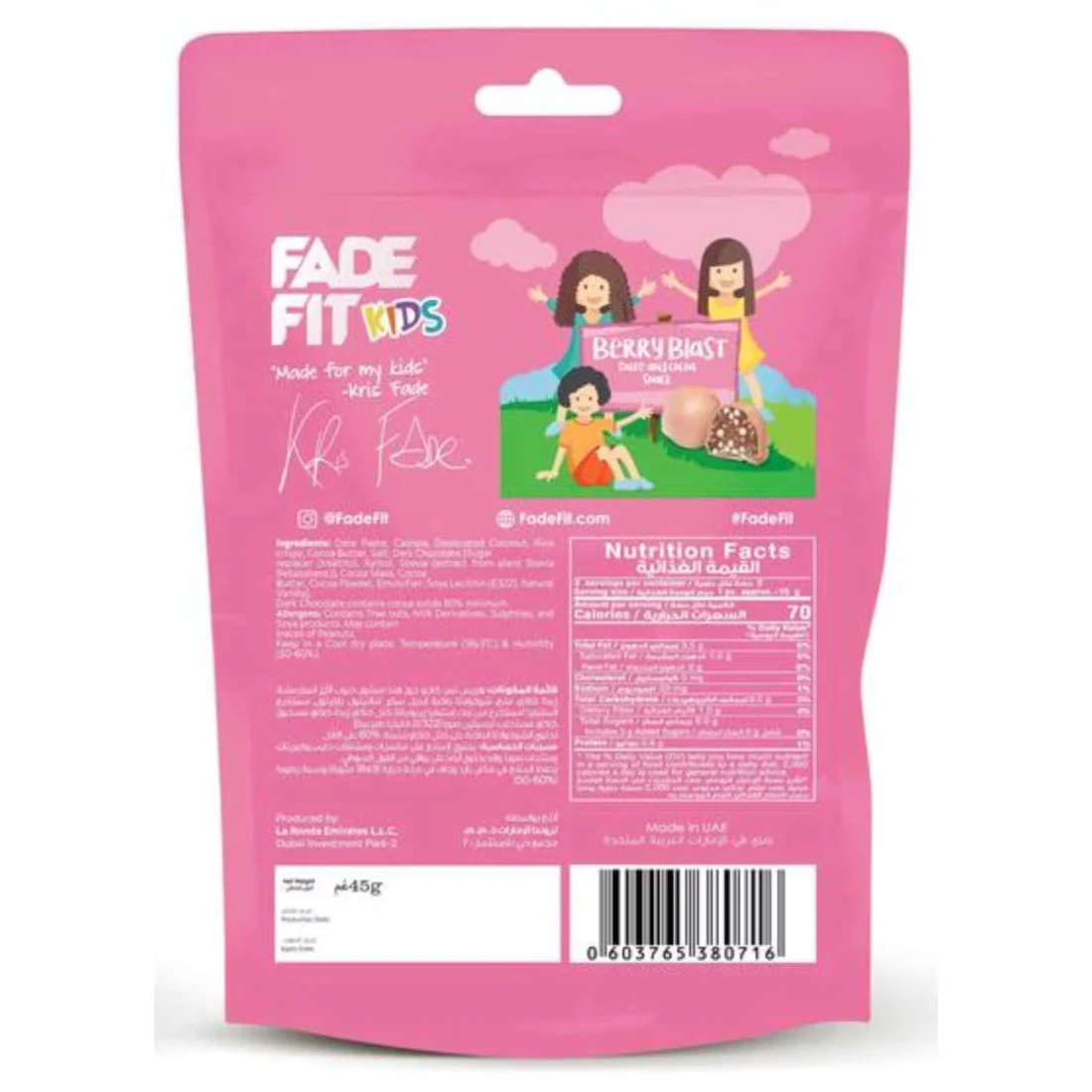 Fade Fit Kids Berry Blast Energy Balls are a delicious and nutritious snack specifically designed for children. These energy balls are made with all-natural ingredients including oats dates almonds and berries and are free from artificial colours flavours and preservatives. Perfect for on-the-go these 45g energy balls are a great source of energy for active kids. They are also gluten-free and suitable for vegans making them a versatile snack option for all dietary needs.