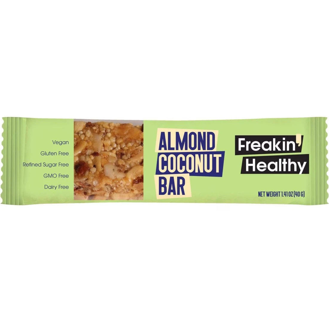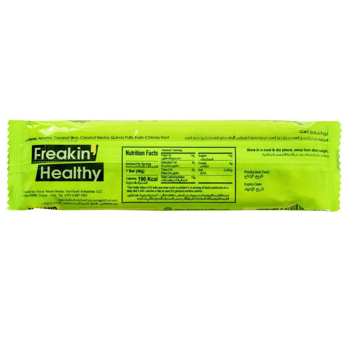 The Freakin' Healthy Almond Coconut Bar is a delicious and nutritious snack bar packed with the goodness of almonds and coconut. Made with all-natural ingredients, this 40g bar is perfect for those looking for a healthy and nutritious on-the-go snack. It is gluten-free, vegan, and free from artificial preservatives, additives, and sweeteners. The almond coconut bar is a great source of energy and provides a satisfying blend of flavours, making it a perfect choice for anyone looking for a tasty and guilt-free treat.