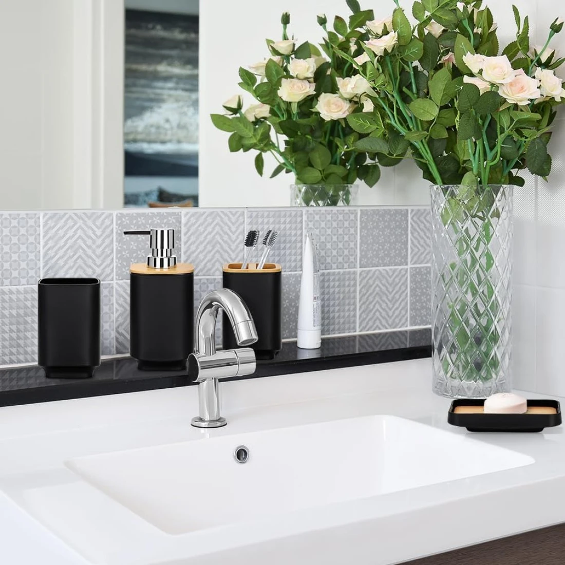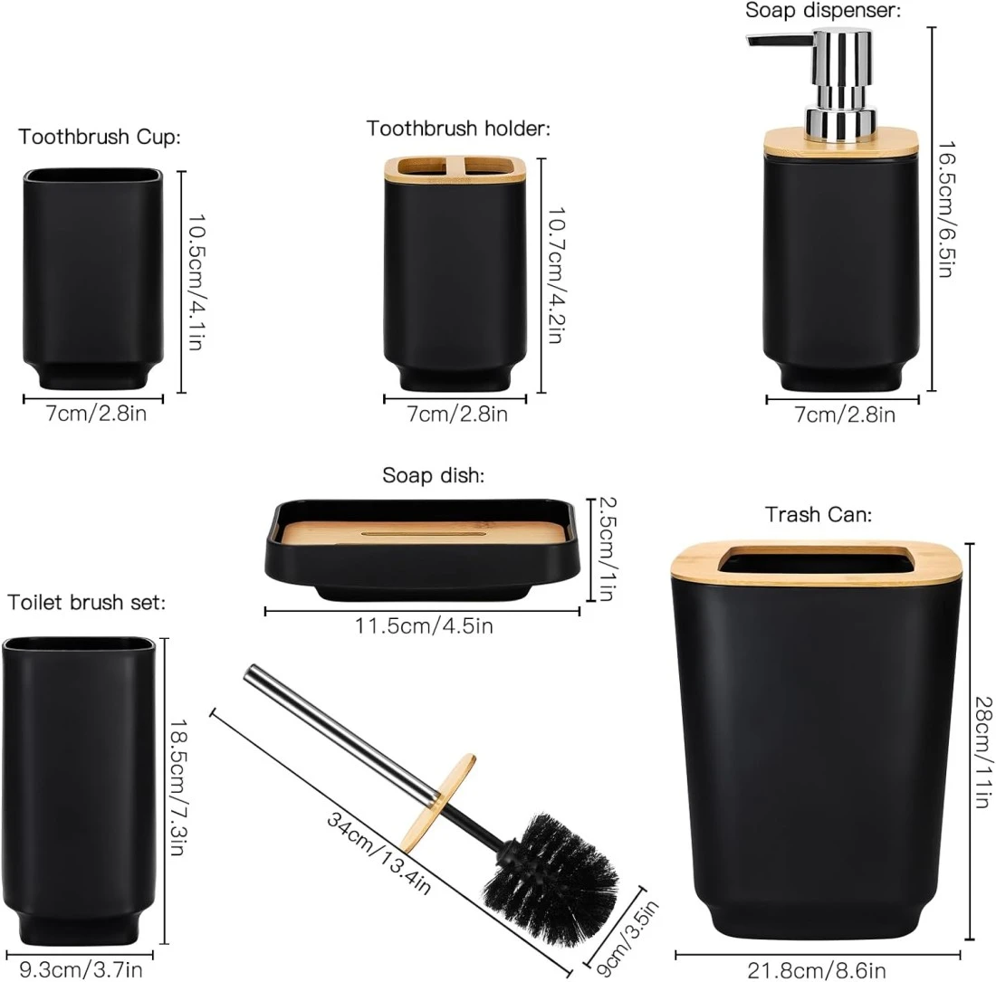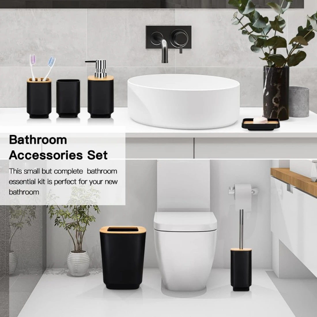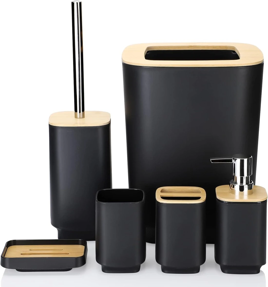 Bamboo Bathroom Accessories Set of 6 Modern Design 6 Pieces Bathroom Accessory Set Soap Dispenser Toothbrush Holder Tooth Mug Soap Dish Toilet Brush Rubbish for Bathroom Home Decor (Black)