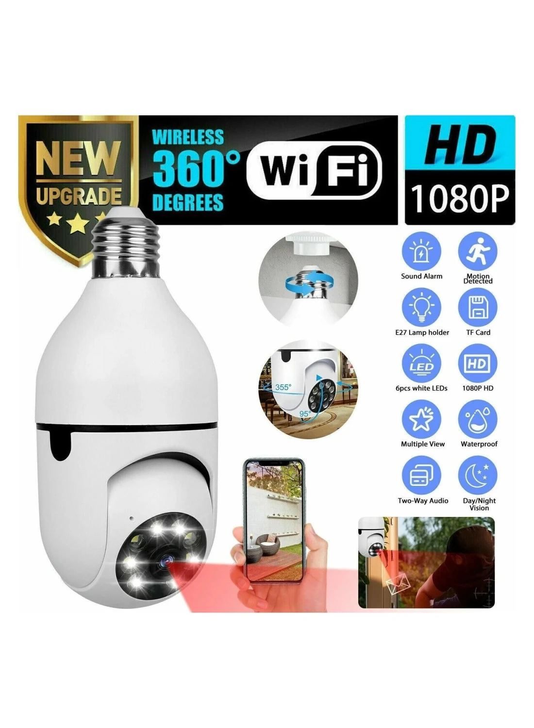 360° Wi-Fi Panorama Camera - Full HD 1080p Wireless Security Surveillance Indoor/Outdoor Motion Detection, Night Vision, Two-Way Audio