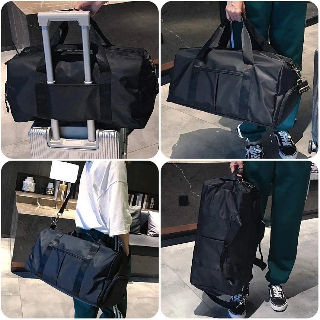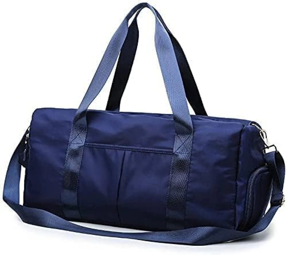 Lightweight Material :This gym duffel bag is made of light and durable Oxford cloth, internal polyester lining with PVC waterproof compartment. Metal accessories and precision wiring are used at the connection to prevent break and tear. Functional Division : Our duffel bag includes 3 main functional partitions.1 large space main pouch,1 fully waterproof wet pocket(for wet swim wear/ sweat gym clothes, socks and towel),1 independent shoe compartment(fit 13' sneakers). Suitable Dimension: SIZE of 19.3" X 9.44" X 10.24"(L x W x H).Could carry 2-3 sets of clothes, essential cosmetics and 1-2 pairs of shoes. Great for use as a dry wet separated sports bag, gym bag, beach bag, swimming bag, weekender bag, overnight bag. Travel Essential Bags : There is a strap on the back of the duffle bag that can be easily placed on your trolley case. During the journey, it can move firmly on the suitcase without burdening you. It is suitable for carrying clothes that you need when you board the plane. Wide Application : This roomy bag can hold a lot of things, and everything needed for the gym and short-term travel can be stored in an orderly manner. It is a great bag for workout, travel, sports activity, tennis, basketball, yoga, fishing, hunting, camping, hiking and many outdoor activities.