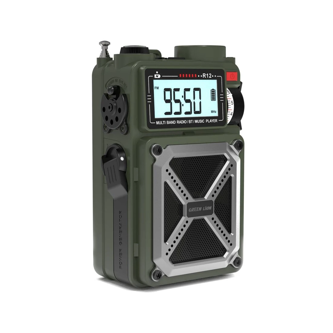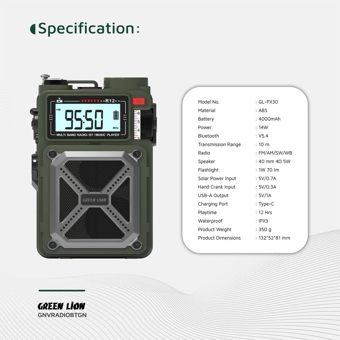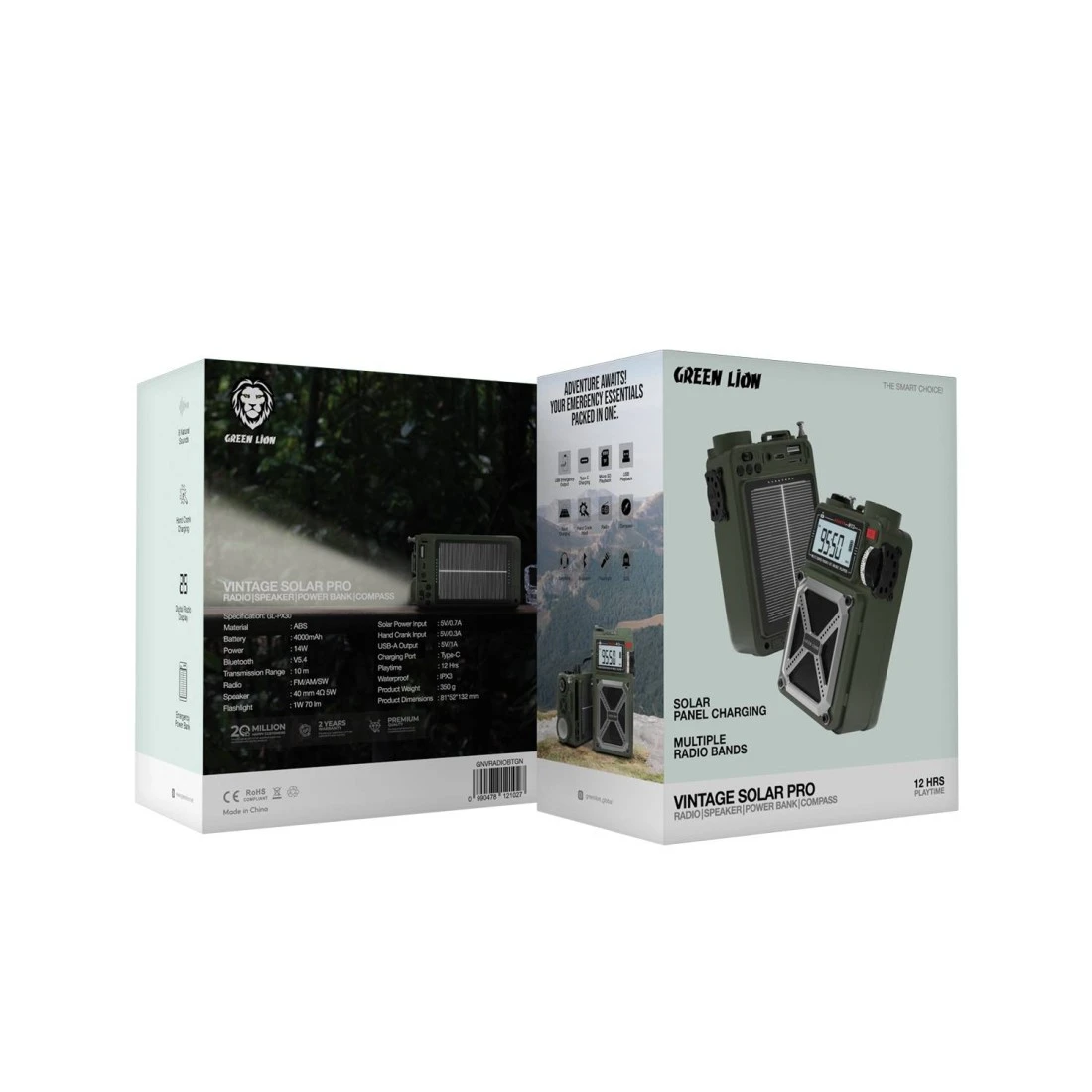 Green Lion Vintage Solar Pro Radio and Bluetooth Speaker with Power Bank, 4000mAh Battery, Solar Power Input 5V/0.7A, Hand Crank Charging, 10m Transmission Range, IPX3 Waterproof, 12H Playtime