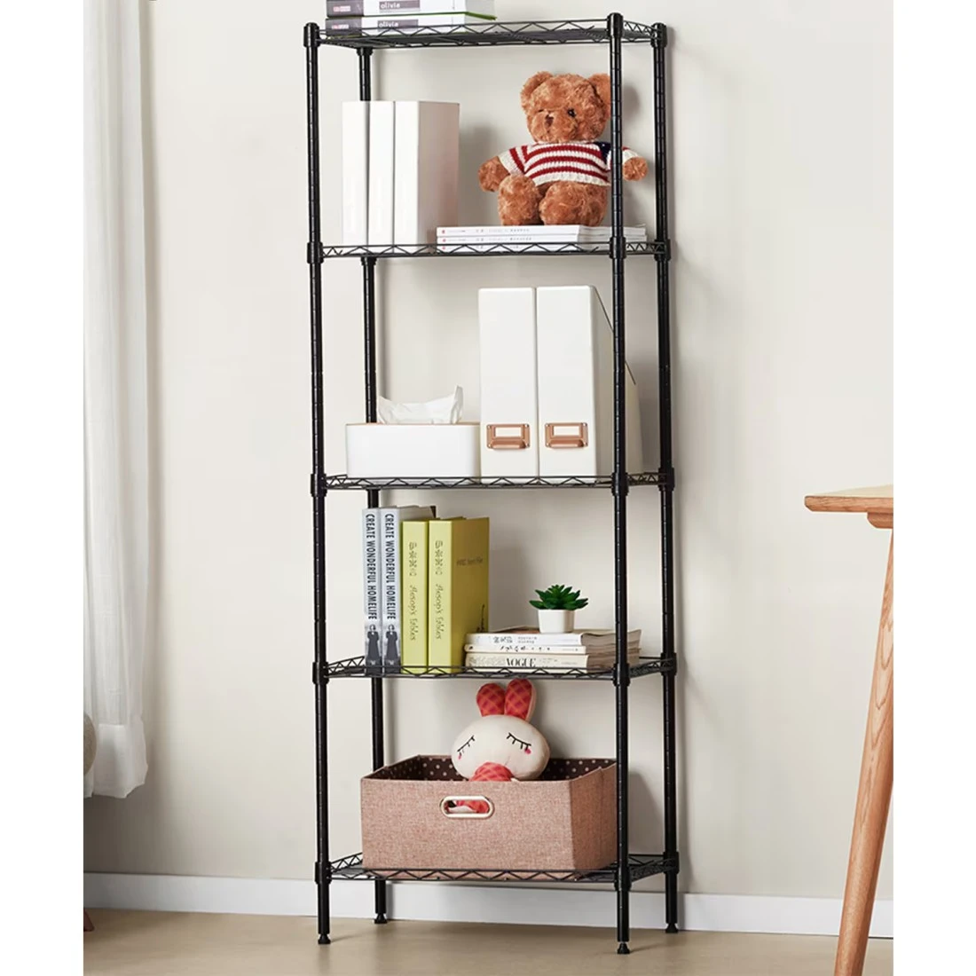 This 5-tier storage rack is great for keeping things well organized and accessible. It is made of carbon steel with baked enamel finishes, heavy duty and anti-rust. Featuring adjustable height and leveing feet, it is a really useful home organizer.