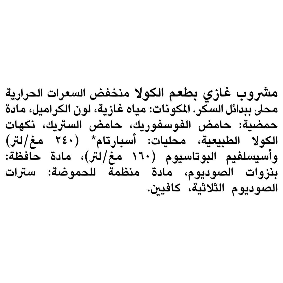 ingredients : Carbonated Water, Caramel Color, Acidifier: Phosphoric Acid, Citric Acid, Natural Cola Flavors, Sweeteners: Aspartame(240mg/L) and Acesulfame Potassium (160mg/L), Preservative: Sodium Benzoate, Acidity Regulator: Sodium Citrate, Caffeine.