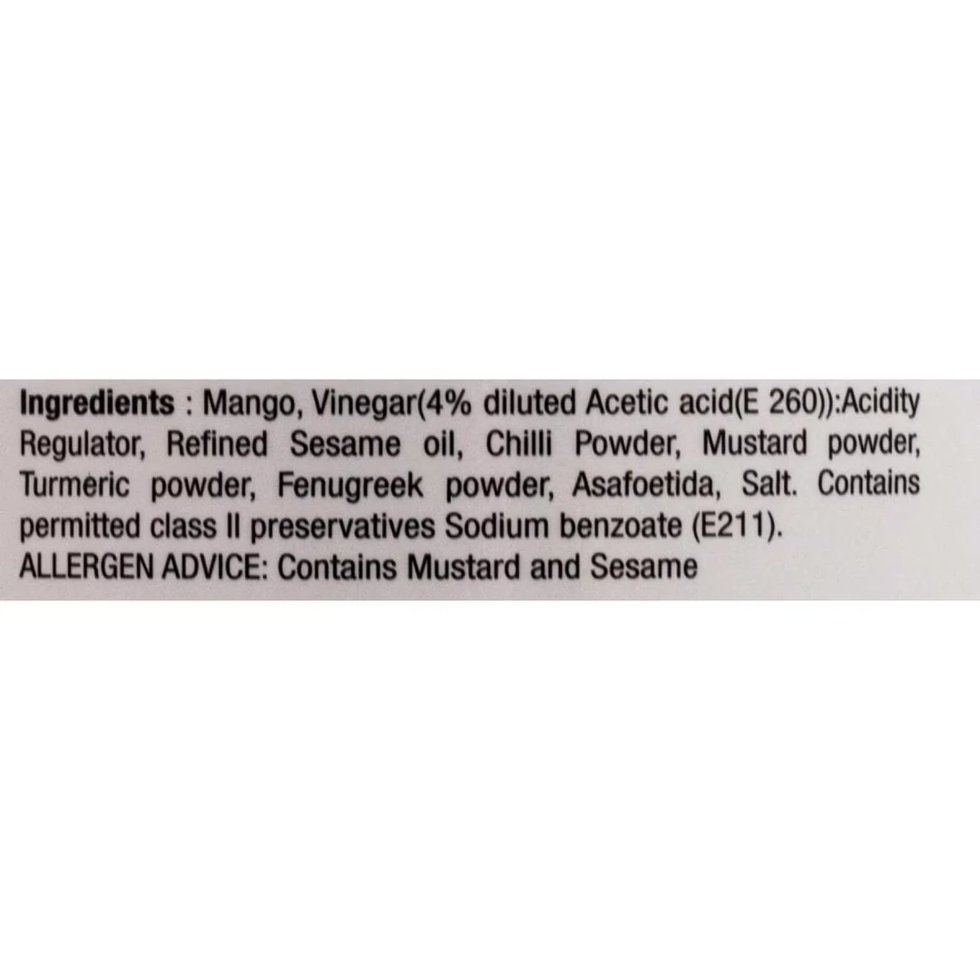 ingredients : Mango Pieces, Refined Sesame Oil Kashmiri Chilli, Mustard Dal, Salt, Vinegar (4% Diluted Acetic Acid (E26)): Acidity Regulator, Asafoetida, Fenugreek, Turmeric, Curry Leaves