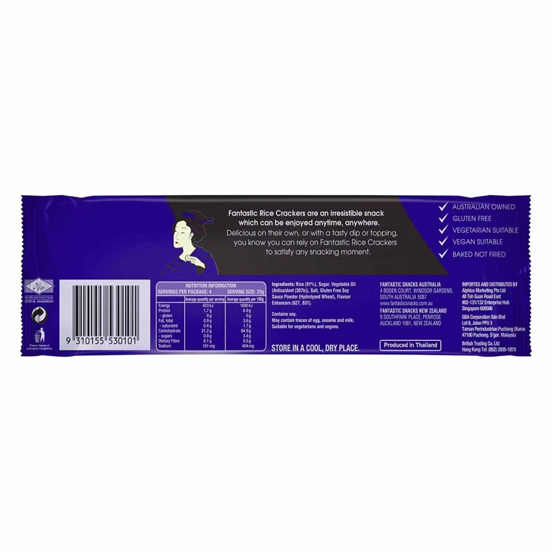 Fantastic Original Rice Crackers are a delicious and crunchy snack made with real rice. These crackers are seasoned with a savoury blend of spices giving them a unique and flavourful taste. They are perfect for snacking on their own or pairing with your favourite dips and spreads. The 100g size makes them convenient to take on-the-go or enjoy as an afternoon pick-me-up. These rice crackers are also gluten-free making them a great option for those with dietary restrictions.