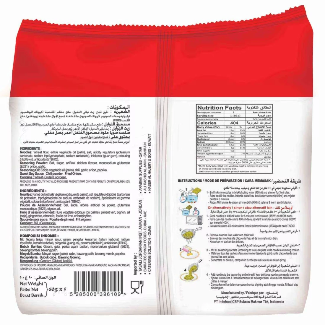 ingredients : Noodles: wheat flour, refined palm oil, salt, sodium tripolyphosphate, potassium carbonate, sodium carbonate, guar gum, riboflavin Seasoning Powder: Salt, Sugar, artificial chicken flavour, monosodium glutamate, disodium guanylate, disodium inosinate, onion, garlic, silicon dioxide Seasoning Oil: Refined Palm Oil, Chili, garlic, shallot, paprika Sweet Soy Sauce: Sugar, water, wheat, soy bean, salt spices, vegetable oil Dried Chili Powder, Fried Shallot