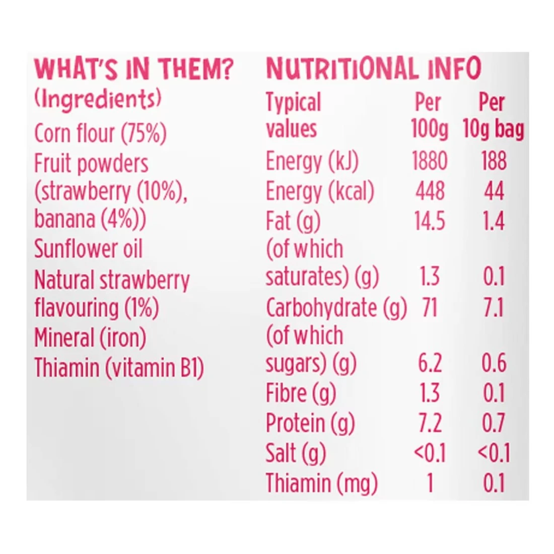 ingredients : Corn Flour (75%), Fruit Powders (Strawberry (10%), Banana (4%)), Sunflower Oil, Natural Strawberry Flavouring, Mineral (Iron), Thiamin (Vitamin B1).