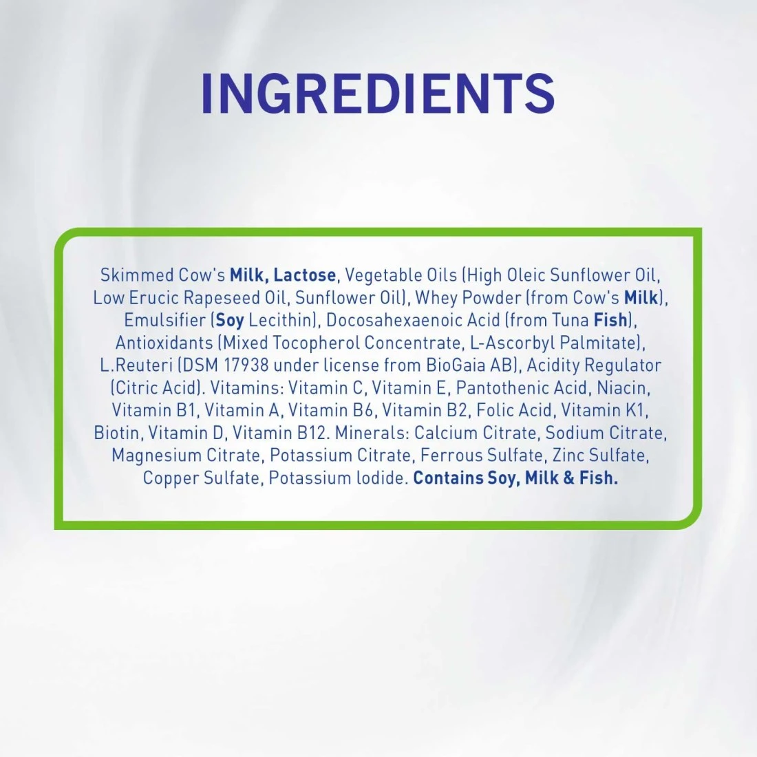 ingredients : Skimmed Cow's Milk, Palm Olein, Whey Powder, Lactose, Sucrose, Low Erucic Acid Rapeseed Oil, Coconut Oil, Sunflower Oil, Emulsifier (Soy Lecithin), Lactobacillus Culture And Minerals And Vitamins. Lactobacillus Culture