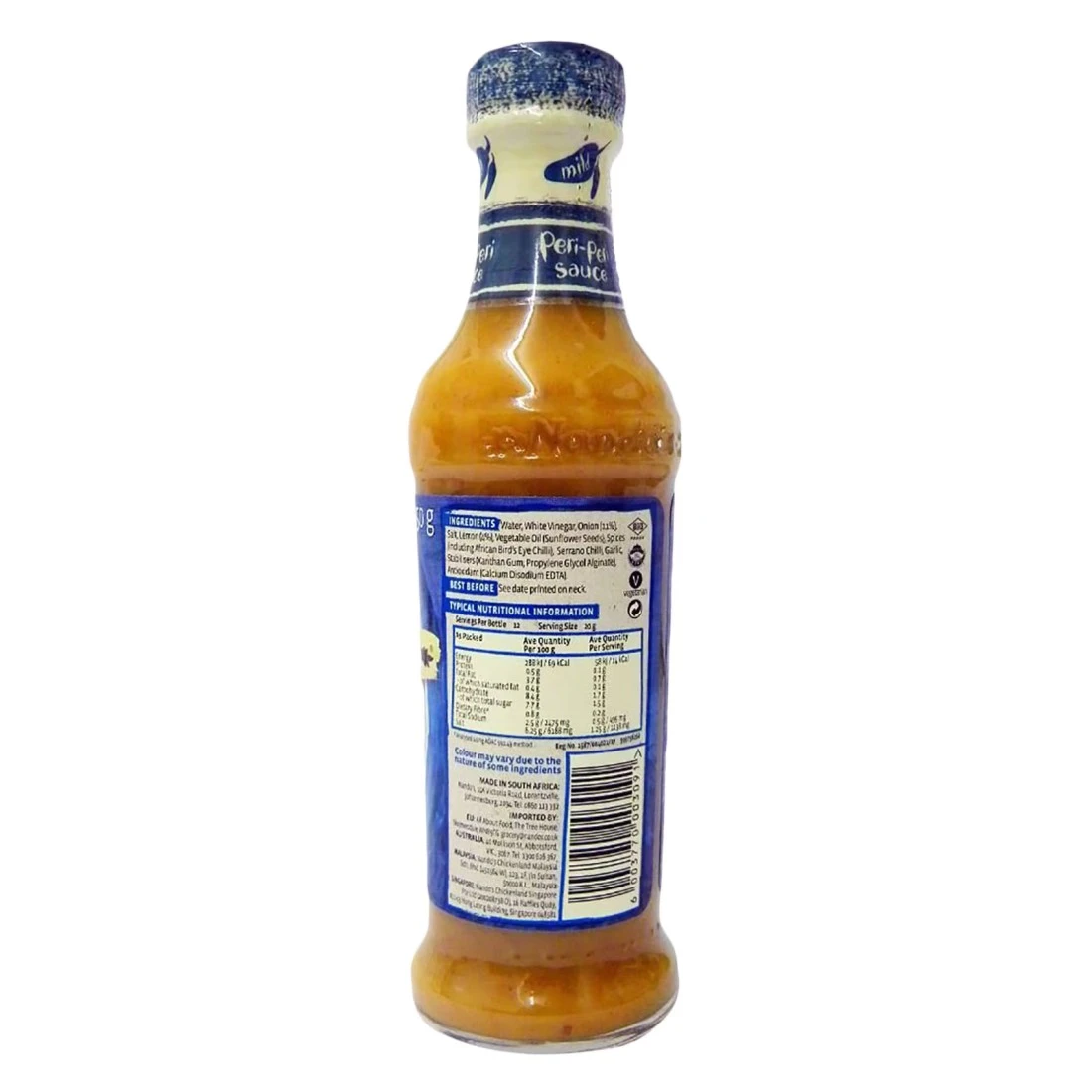 Nando's Mild Peri Peri Sauce is a popular South African sauce that adds a tangy and mildly spicy flavour to any dish. Made from a blend of fresh herbs garlic and Peri Peri chili peppers this sauce is known for its unique taste and versatility. It can be used as a marinade dipping sauce or even as a condiment to spice up your meals. With its mild heat level, it is perfect for those who enjoy a hint of spice without overwhelming their taste buds. The Nando's Mild Peri Peri Sauce comes in a 250g bottle making it convenient to use and store.