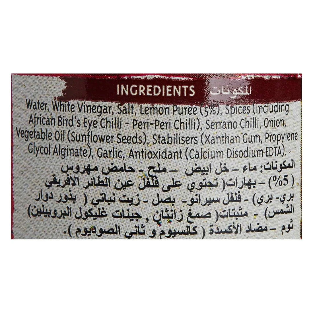 ingredients : Water, Distilled Vinegar, Spices (African Bird's Eye Chilli, Cayenne Pepper, Paprika), Lemon Puree (5%), Salt, Onion Puree (3%), Sunflower Seed Oil, Green Chilli, Stabilisers (xanthan Gum, Propylene Glycol Alginate), Garlic Puree, Thickener (modified Maize Starch), Antioxidant (ascorbic Acid), Rosemary Extract
